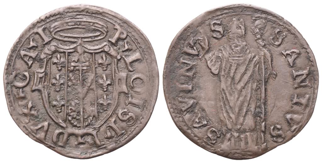 CASTRO. Pier Luigi Farnese (1545-1547). Quattrino; Æ (0,62 g; 17,6 mm) P LOISI F DVX CA I Stemma a cuore. Rv. SANTVS SAVINVS Busto di San Savino, con mitria e paramenti vescovili, regge pastorale e solleva la destra per benedire.CNI, Tav. XVII n. 26 (83). SPL. Patina marrone.