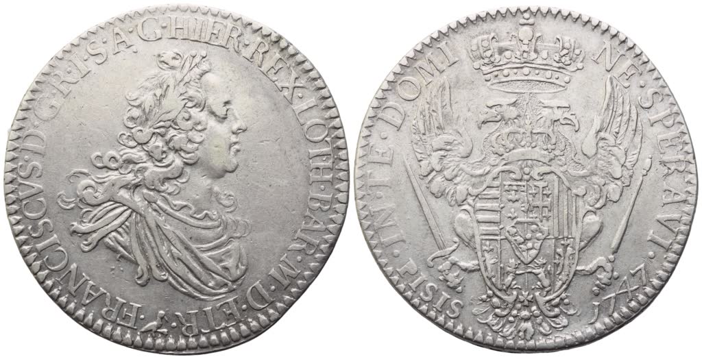 FIRENZE. Granducato di Toscana. Francesco II di Lorena (1737-1765). Francescone 1747; Ag (27,18 g; 40 mm) FRANCISCVS D G R I S A G HIER REX LOTH BAR M D ETR Busto laureato e corazzato a destra; segno dello zecchiere Carlo La Garde. Rv. IN TE DOMINE SPERAVI Aquila bicipite coronata caricata di stemma multipartito; ai lati, nel giro, PISIS – 1747. Galeotti XII, 1. MIR 360. Raro. BB+/qSPL
