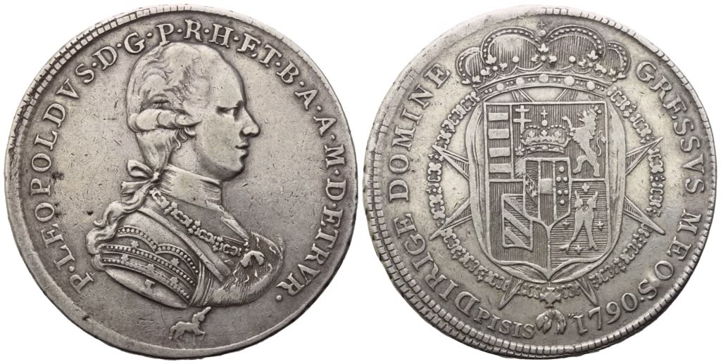 FIRENZE. Granducato di Toscana. Pietro Leopoldo I d'Asburgo Lorena (1765-1790). Francescone 1790; Ag (27,05 g; 40,8 mm) P LEOPOLDVS D G P R H ET B A A M D [ETRV]R Busto corazzato, a destra, con Collare del Toson d'Oro e Croce di Santo Stefano sul petto; nel taglio del braccio, L·S·F· (Luigi Siries, incisore); sotto, nel giro, unicorno (Francesco Grobert, zecchiere). Rv. DIRIGE DOMINE - GRESSVS MEOS. Stemma coronato circondato dal Collare del Toson d'Oro e caricato su Croce di Santo Stefano; sotto, PISIS - 1790. MIR 385/8. R3. BB+