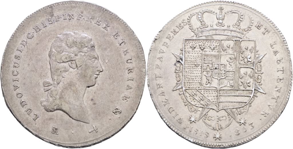FIRENZE. Regno d'Etruria. Ludovico I di Borbone (1801-1803). Francescone da 10 Paoli 1803; Ag (27,50 g) LUDOVICUS I D G HISP INF REX ETRURIAE Testa nuda a destra; in basso, monogramma LS (Luigi Siries, incisore) e martello (Giovanni Fabbroni, Maestro di Zecca). Gig. 8. SPL
