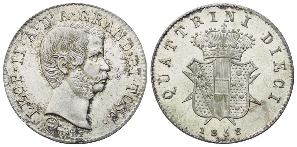 FIRENZE. Granducato di Toscana. Leopoldo II di Lorena (1824-1859). 10 Quattrini 1858; Mi (1,98 g; 19,6 mm) LEOP II A D'A GRAND DI TOSC Testa nuda a destra; in basso, scudetto Guicciardini (direttore di zecca) e GORI (incisore). Rv. QUATTRINI DIECI Stemma coronato su croce di Santo Stefano; in basso, 1858. Pag. 167; Mont. 374; MIR 461; Gig. 67. SPL+