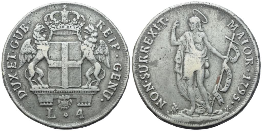 GENOVA. Repubblica. Dogi Biennali (1528-1797). 4 Lire 1795; Ag (13,87 g; 33,5 mm) DUX ET GUB REIP GENU Stemma della Repubblica coronato e sostenuto da due grifi alati, poggiato su base decorata con maschera leonina; in esergo, L 4. Rv. NON SURREXIT MAJOR 1795 San Giovanni stante di fronte con il capo rivolto a sinistra, in atto benedicente e con croce sul cui cartiglio ECCE AGNUS DEI. MIR 313/2, CNI 9, Lunardi 367. Rara. qBB