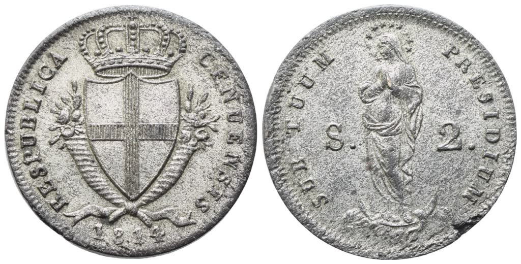GENOVA. Repubblica genovese (20 aprile 1814-4 gennaio 1815). 2 Soldi 1814; Mi (2,14 g; 17,6 mm)