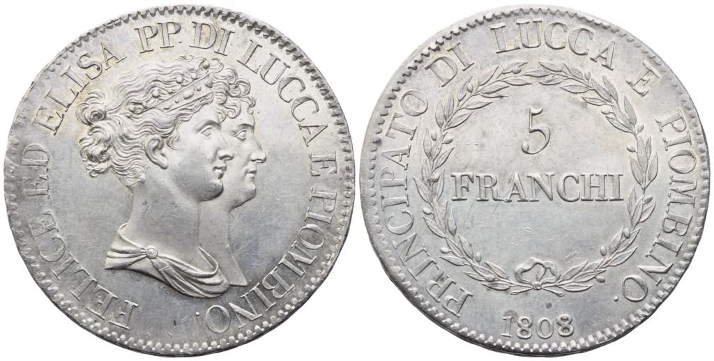 LUCCA. Principato di Lucca e Piombino. Elisa Bonaparte e Felice Baciocchi (1805-1814). 5 Franchi 1808; Ag (25 g; 36,5 mm) FELICE ED ELISA PP DI LUCCA E PIOMBINO Busti grandi accollati a destra. Rv. PRINCIPATO DI LUCCA E PIOMBINO Nel centro, 5 / FRANCHI entro rami di lauro legati in basso. Sotto, 1808 (seconda cifra 8 della data su 7). Pag. 254a; Mont. 439; MIR 244/4; Gig. 6. Rara. qFDC. Moneta eccezionale. Fondi lucenti.