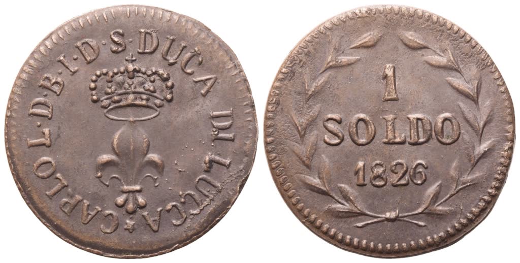 LUCCA. Ducato di Lucca. Carlo Ludovico di Borbone (1824-1847). Soldo 1826; Cu (3,15 g; 21,6 mm) CARLO L D B I D S DUCA DI LUCCA * Giglio coronato. Rv. 1 / SOLDO / 1826 tra due rami d'ulivo legati in basso con nastro. Gig. 13. SPL. Patina marrone.