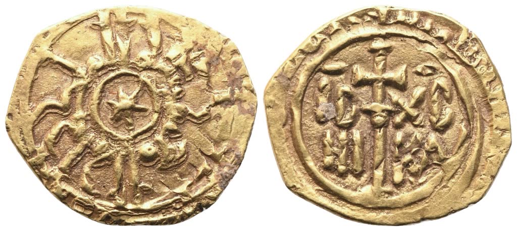 MESSINA o PALERMO. Ruggero II (1140-1154), Tarì; Au (0,88 g; 12 mm) In centro, stella a sei punte; attorno leggenda cufica. Rv. Croce astile entro legenda cufica; ai lati, IC – XC / NI – KA. D'Andrea 234; Travaini 219; Spahr 71. SPL