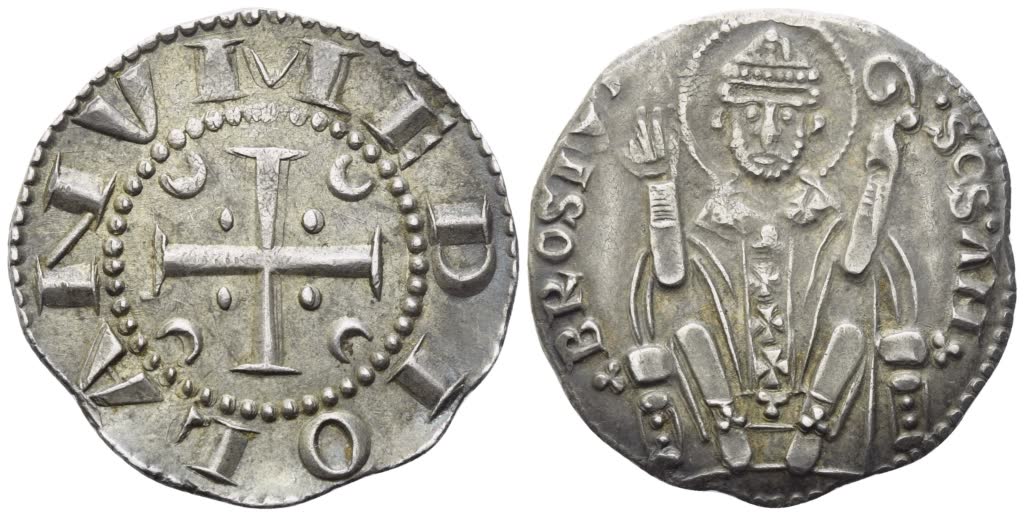 MILANO. Prima Repubblica (1250-1310). Ambrosino; Ag (2,95 g; 21,5 mm) MEDIOLANV Croce potenziata; agli angoli, quattro crescenti e quattro globetti. Rv. SAS AMBROSIV Sant'Ambrogio, frontale e seduto su trono decorato da trifogli, regge pastorale e solleva la d. per benedire. CNI 17/19; Crippa 24; Biaggi 1245; MIR 66/4. R2. SPL+/qFDC