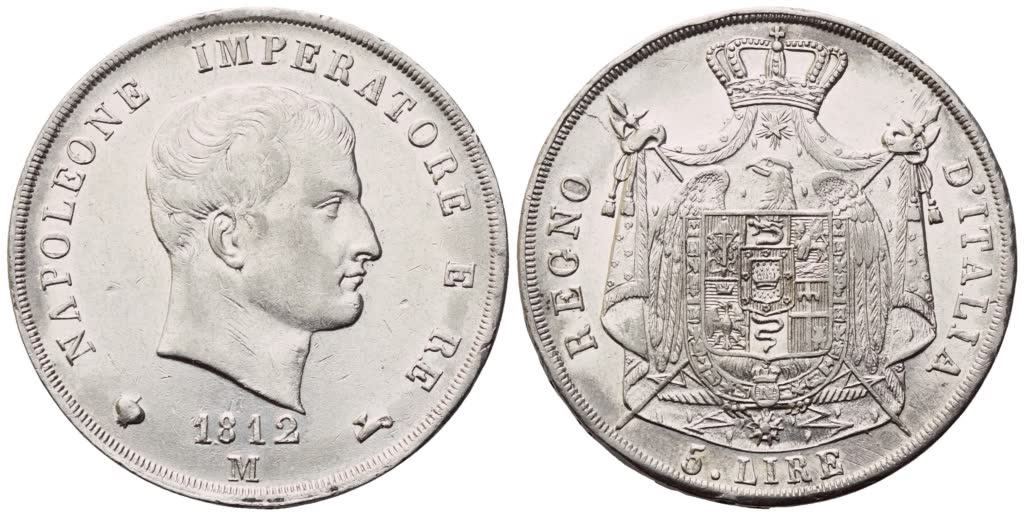 MILANO. Napoleone I Re d'Italia (1805-1814). 5 Lire 1812; Ag (25 g; 37 mm) NAPOLEONE IMPERATORE E RE Test nuda a destra; in basso, 1812 tra marchi di zecca. Rv. REGNO D'ITALIA Stemma coronato su padiglione sorretto da alabarde decussate con puntali aguzzi; in basso, 5 LIRE. Pag. 30 var. (A senza barretta orizzontale al D/); Gig. 112a. SPL+/qFDC. Fondi lucenti.