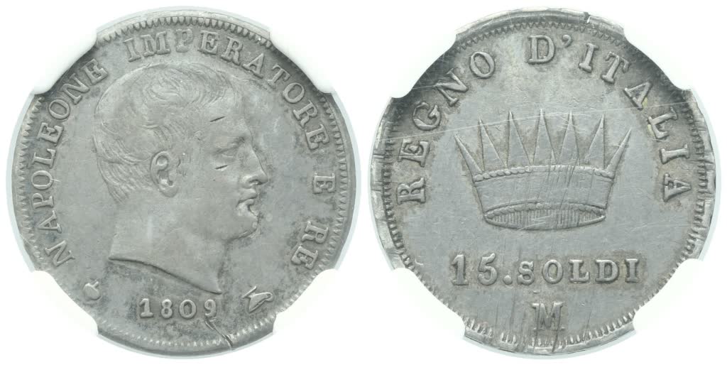 MILANO. Napoleone I Re d'Italia (1804-1814). 15 Soldi 1809; Ag (3,75 g; 21 mm) NAPOLEONE IMPERATORE E RE Testa nuda a destra; in basso, 1809. Rv. REGNO D'ITALIA Corona ferrea radiata; in basso, 15 SOLDI / M. Gig. 173. R3. In slab NGC XF 40. SPL. Segnetti.