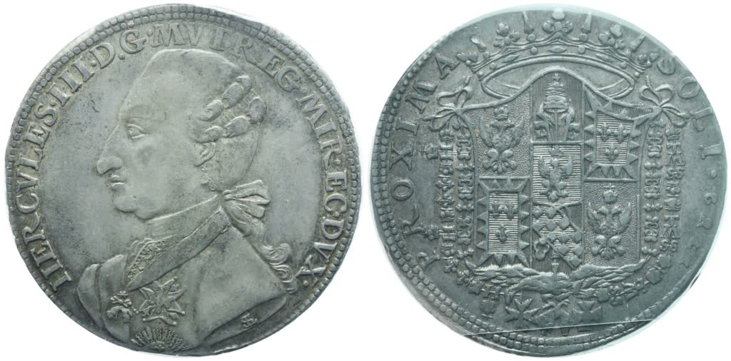 MODENA. Ducato di Modena, Reggio e Mirandola. Ercole III d'Este (1780-1796). 3 Scudi 1782; Ag HERCVLES III D•G•MVT•REG•MIR•EC•DVX Busto vestito a sinistra; nel troncato, LS. Rv. scudo estense coronato compreso in collare con ordini cavallereschi. Contorno (ornatino) MISURAM (ornatino) ET (ornatino) PRETIVM (ornatino) (B) . MIR 857/1, CNI 2, Ravegnani M. 3. Rara. Periziata G. Erpini. SPL+