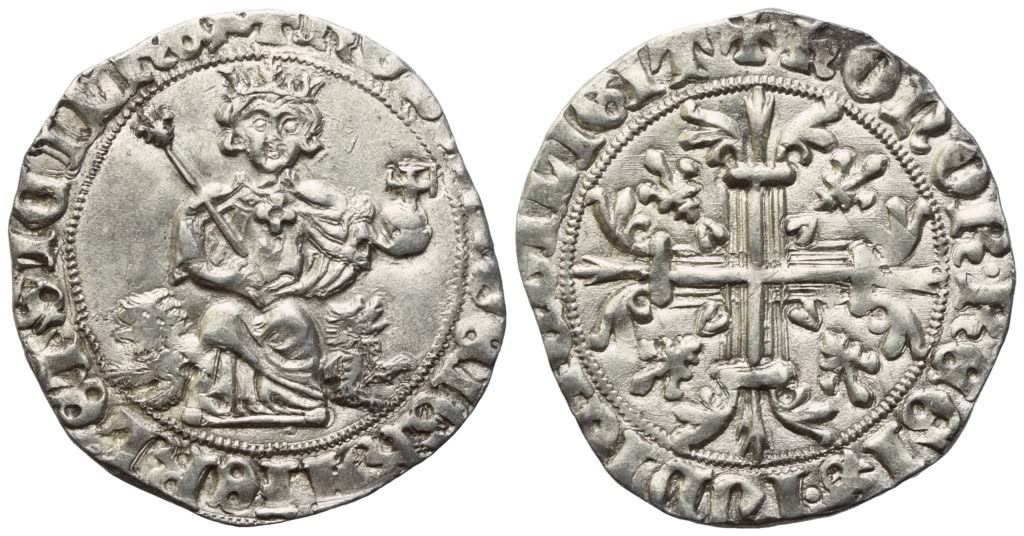NAPOLI. Regno di Napoli. Roberto d'Angiò (1309-1343). Gigliato; Ag (3,96 g; 26,2 mm) + ROBERT DEI GRA IERL ET SICIL REX Re seduto di fronte in trono di leoni, con scettro gigliato nella destra e globo crucigero nella sinistra; Rv. + HONOR REGIS IUDICIU DILIGIT Croce gigliata cantonata da quattro gigli. Pannuti-Riccio 2; MEC 14, 695/697; MIR 28. SPL+