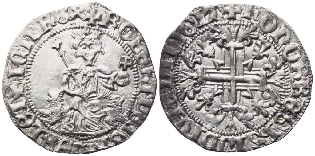 NAPOLI. Regno di Napoli. Roberto d'Angiò (1309-1343). Gigliato; Ag (3,97 g; 27 g) + ROBERT DEI GRA IERL ET SICIL REX Re seduto di fronte in trono di leoni, con scettro gigliato nella destra e globo crucigero nella sinistra; Rv. + HONOR REGIS IUDICIU DILIGIT Croce gigliata cantonata da quattro gigli. Pannuti-Riccio 2; MEC 14, 695/697; MIR 28. SPL+. Fondi lucenti.