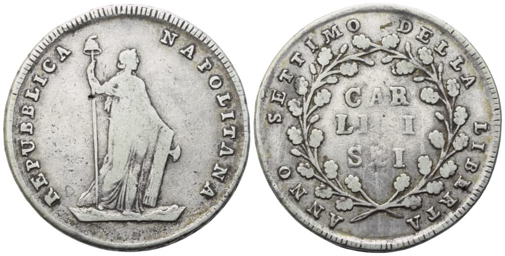 NAPOLI. Repubblica Napoletana (1799). Mezza Piastra da 6 Carlini 1799 (Anno VII); Ag (13,59 g; 31,5 mm; 6 h) REPUBBLICA NAPOLITANA La Libertà, volta a destra, tiene il fascio e l'asta sormontata dal pileo. Rv. ANNO SETTIMO DELLA LIBERTA Nel centro, CAR / LINI / SEI tra due rami di quercia. Pannuti-Riccio 2; Pag. 2; MIR 414; Gig. 2. R2. MB/BB