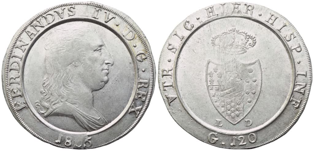 NAPOLI. Regno di Napoli. Ferdinando IV di Borbone (1759-1816). Piastra 1805; Ag (27,57 g; 39 mm) FERDINANDVS IV D G REX 1805 su fascia rilevata. Busto a destra. Rv. VTR SIC HIER HISP INF G 120 su fascia rilevata. Stemma coronato tra L – D (Luigi Diodati, maestro di zecca). Pannuti-Riccio 11; Pag. 11a; Gig. 72b. Non comune. SPL, ottimo lustro; consueti graffietti di zecca al rovescio.