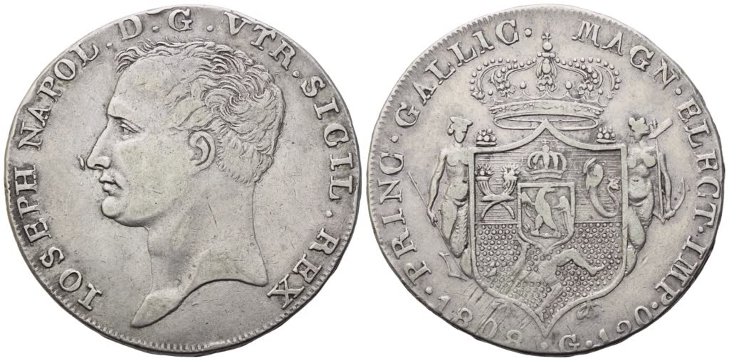 NAPOLI. Regno di Napoli. Giuseppe Napoleone (1806-1808). Piastra 1808; Ag (27,33 g; 37,4 mm) IOSEPH NAPOL D G VTR SICIL REX Testa nuda a sinistra. Rv. PRINC GALLIC MAGN ELECT IMP 1808 G 120 Stemma coronato tra due sirene. Gig. 3; Pannuti-Riccio 3; Mont. 408; Pag. 43. Rara. BB+