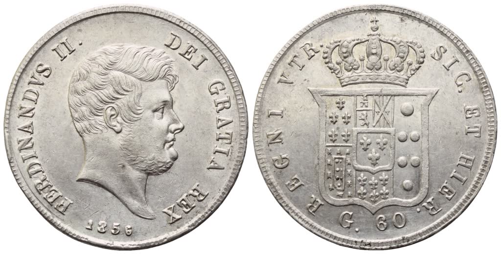 NAPOLI. Regno delle Due Sicilie. Ferdinando II di Borbone (1830-1859). Mezza Piastra 1856; Ag (13,77 g; 30,3 mm) FERDINANDVS II DEI GRATIA REX Testa nuda e barbuta a sinistra; in basso, 1856. Rv. REGNI VTR SIC ET HIER Stemma coronato; in basso, G. 60. Gig. 112. qFDC. Fondi lucenti.
