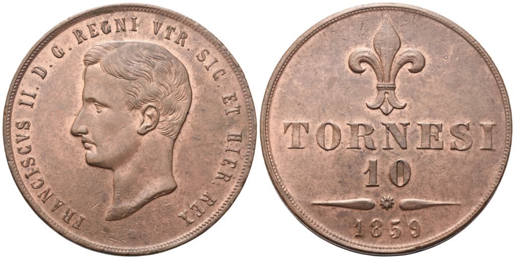 Lotto 135 | NAPOLI. Regno delle Due Sicilie. Francesco II di Borbone (1859-1860), 10 Tornesi 1859; Cu (31 g; 37 mm)
