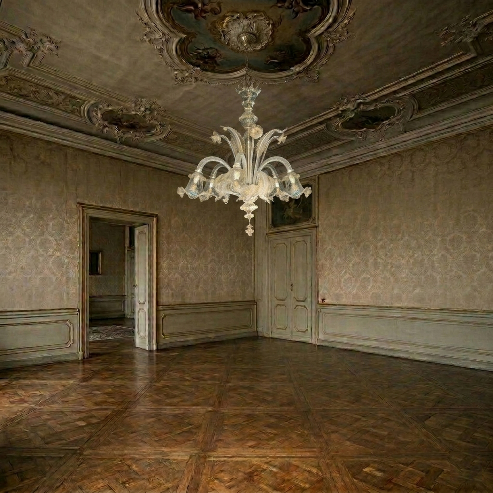 Lampadario in vetro di Murano a 6 luci in vetro trasparente h cm 87X80 Piccole rotture e mancanze