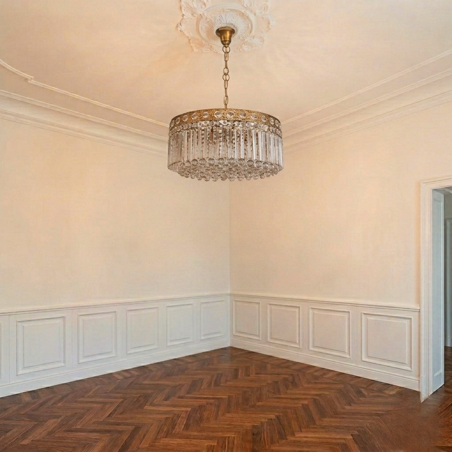 Lampadario a 18 luci stile impero con canne a prima in cristallo e struttura in metallo dorato