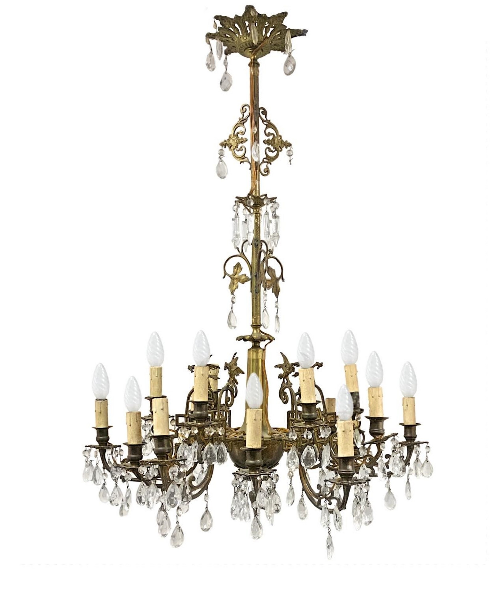 Lampadario in ottone a 18 luci con brindoli in vetro molato, 19° secolo