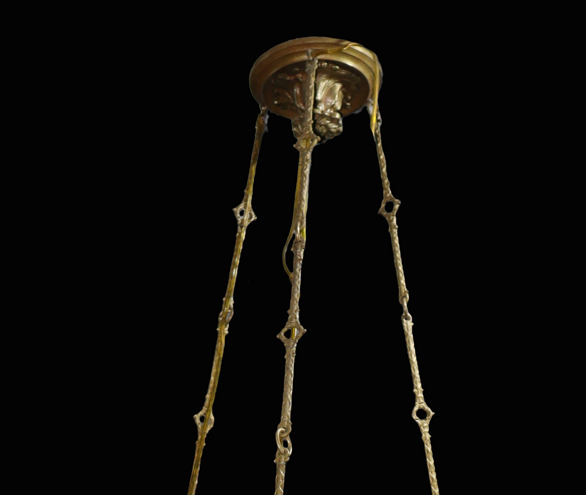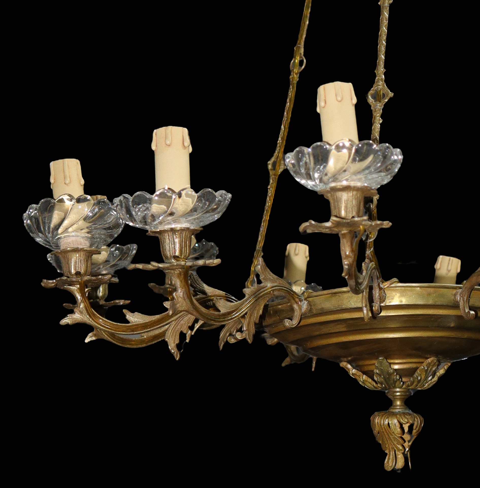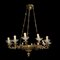 Lampadario a 12 luci in metallo dorato e piattini in vetro , Late 19° secolo