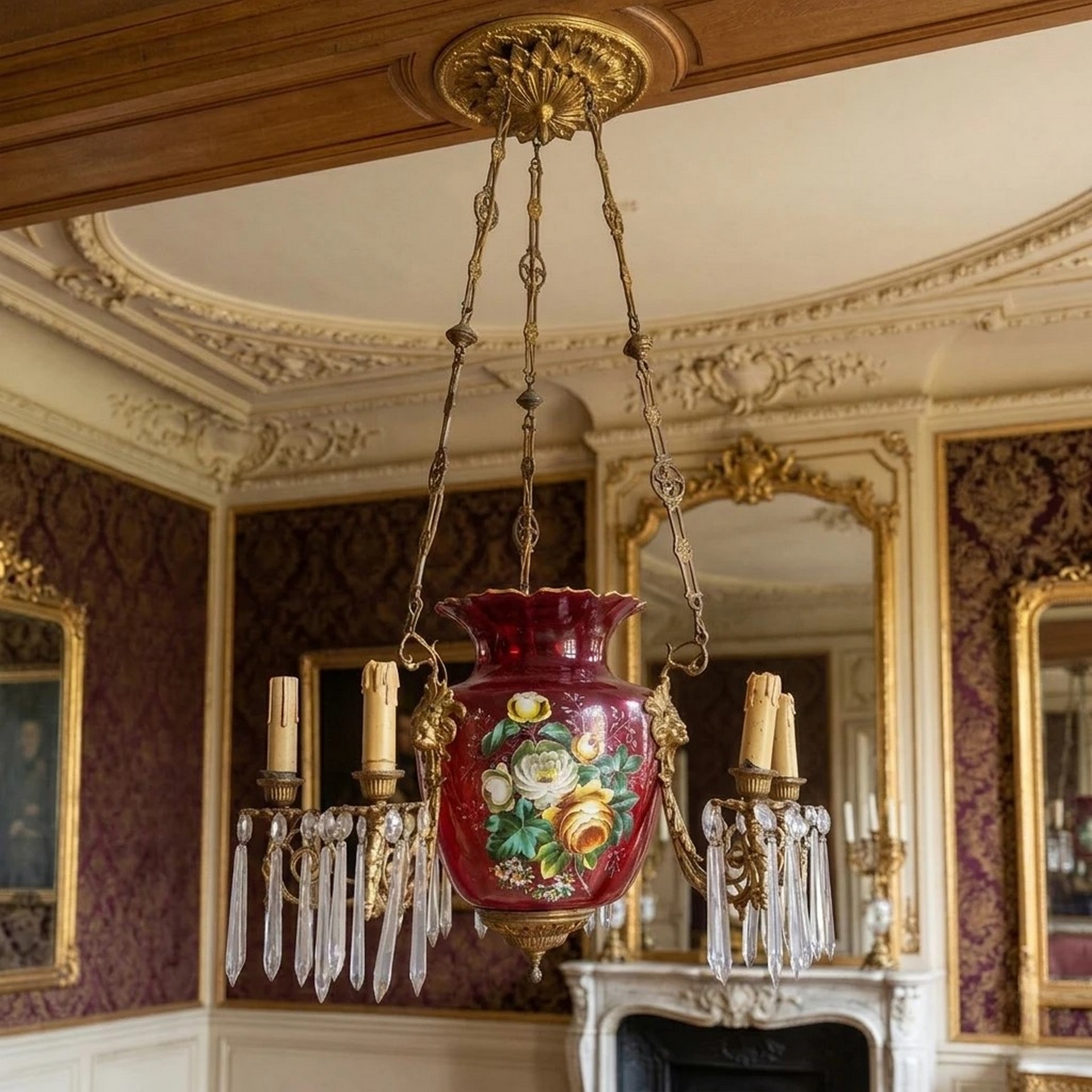 Sospensione in vetro di Murano rosa e dipinto a mano a sei luci