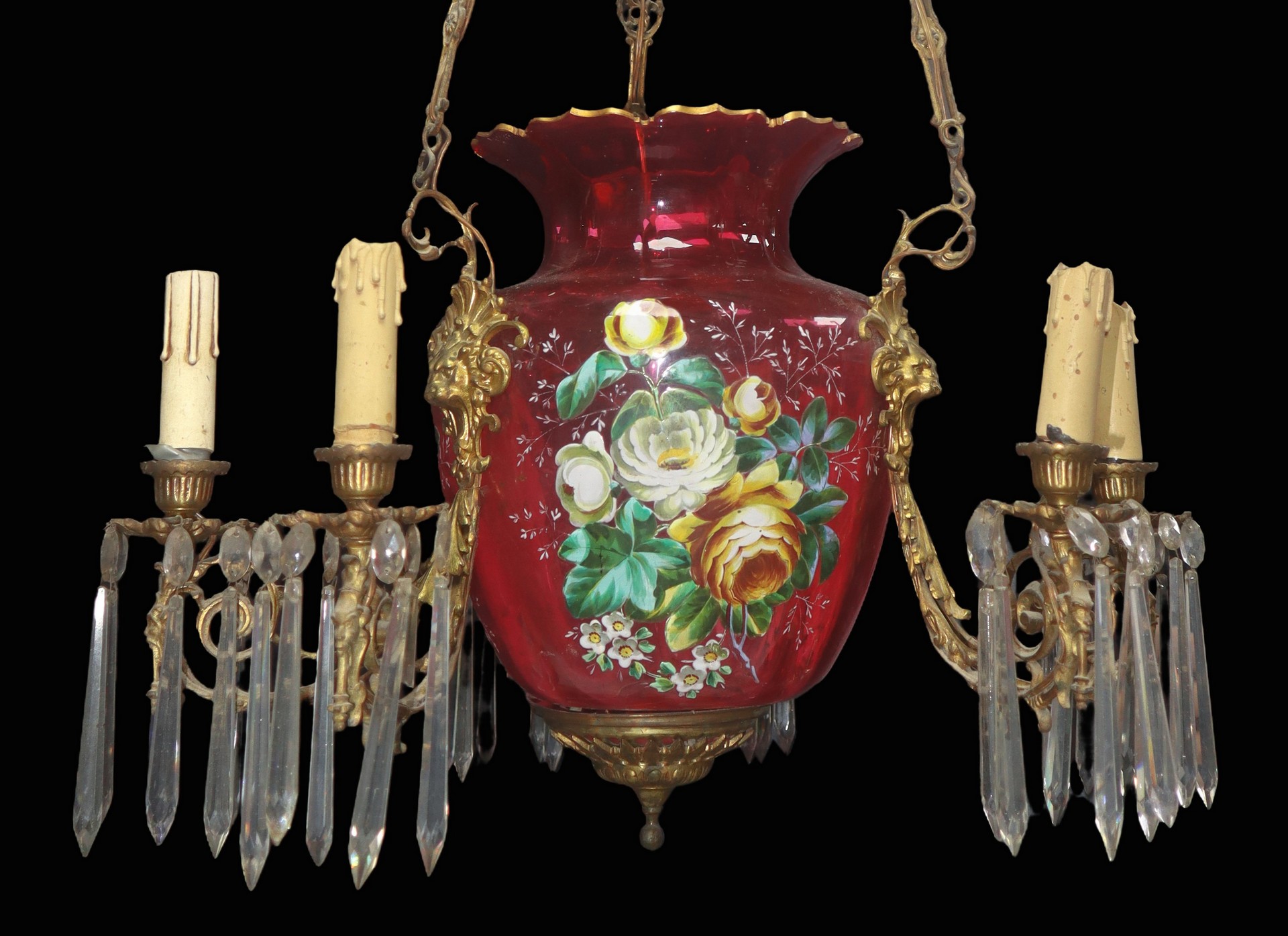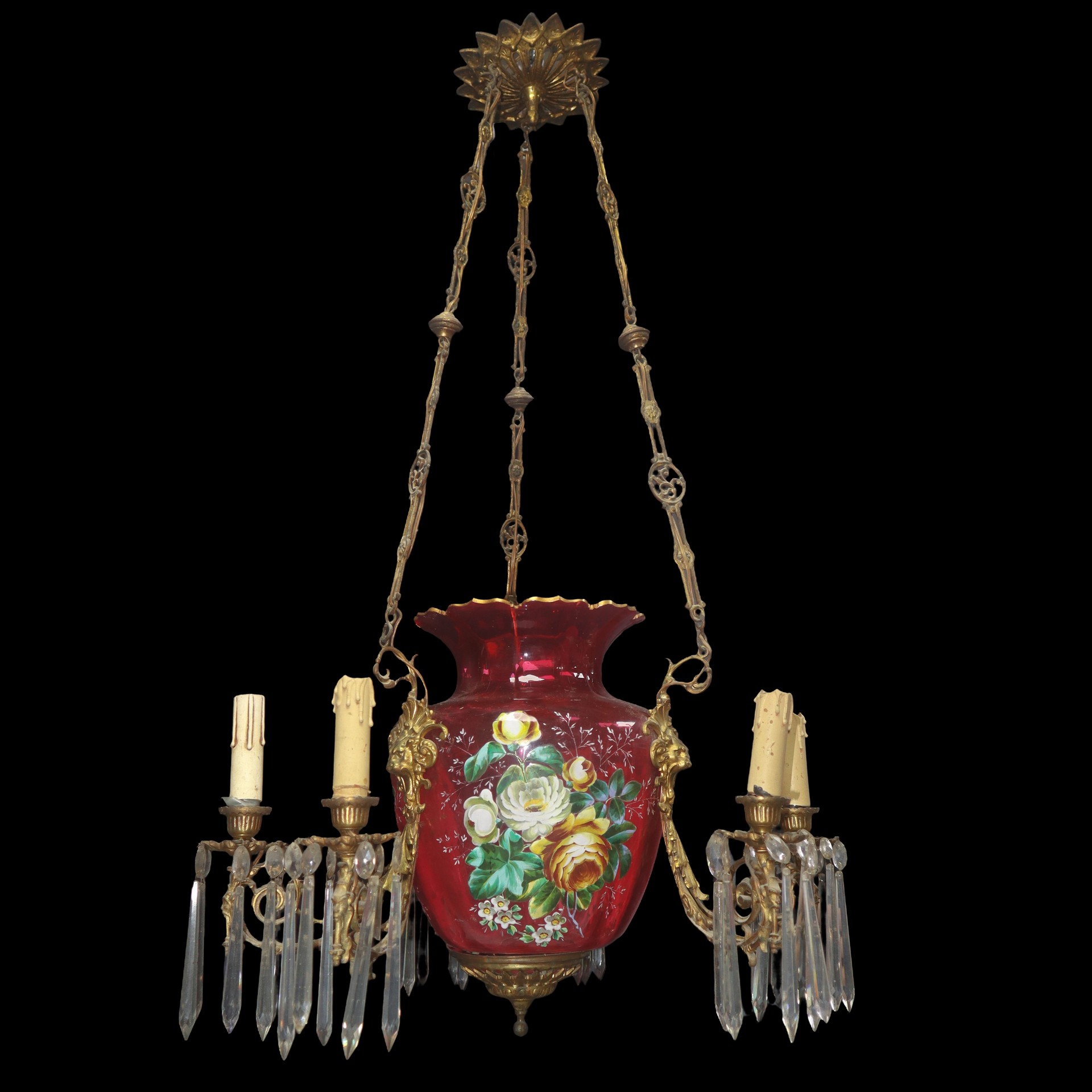 Sospensione in vetro di Murano rosa e dipinto a mano a sei luci H cm 92x54