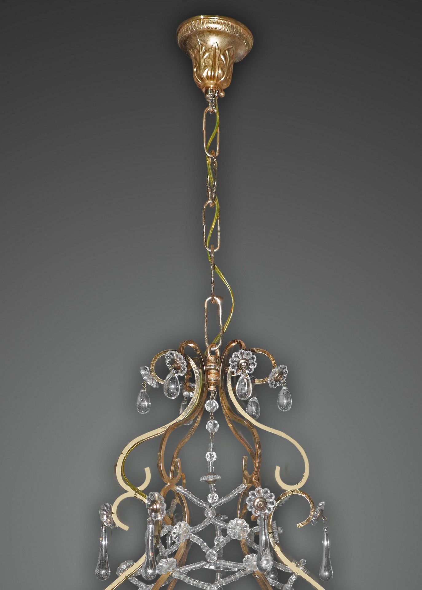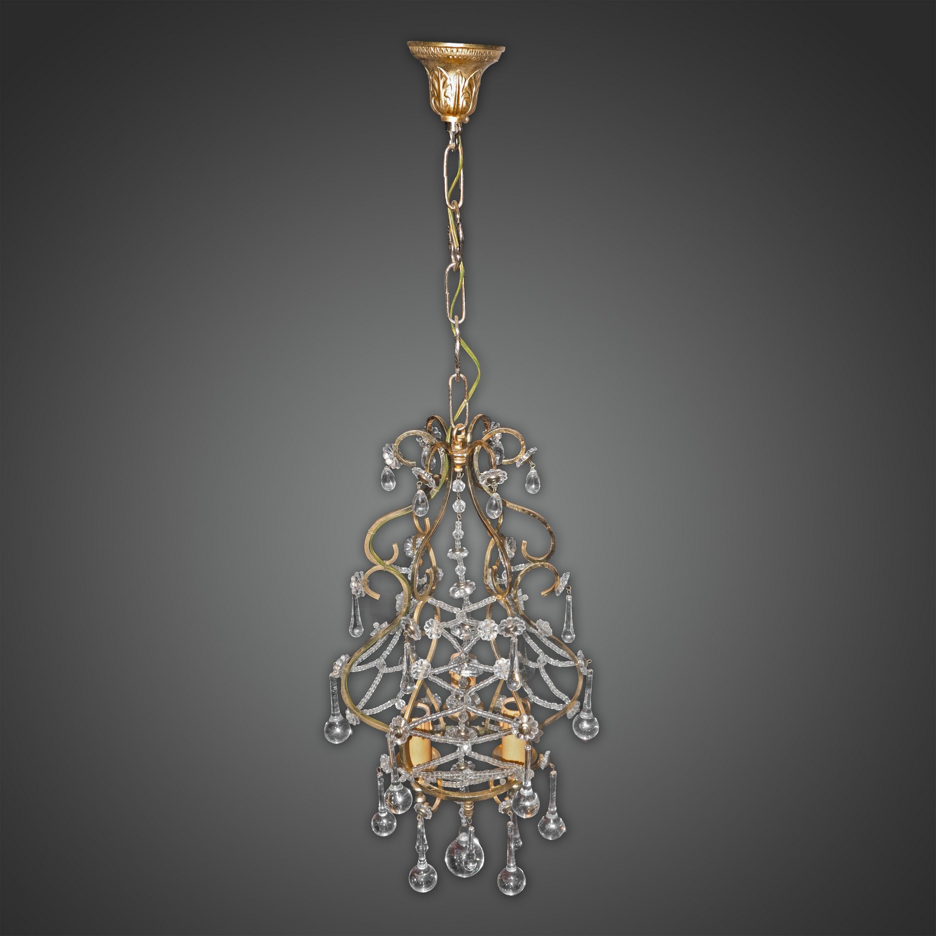 Lampadario a 3 luci in metallo dorato con gocce in vetro di Murano h cm 45,5X25
