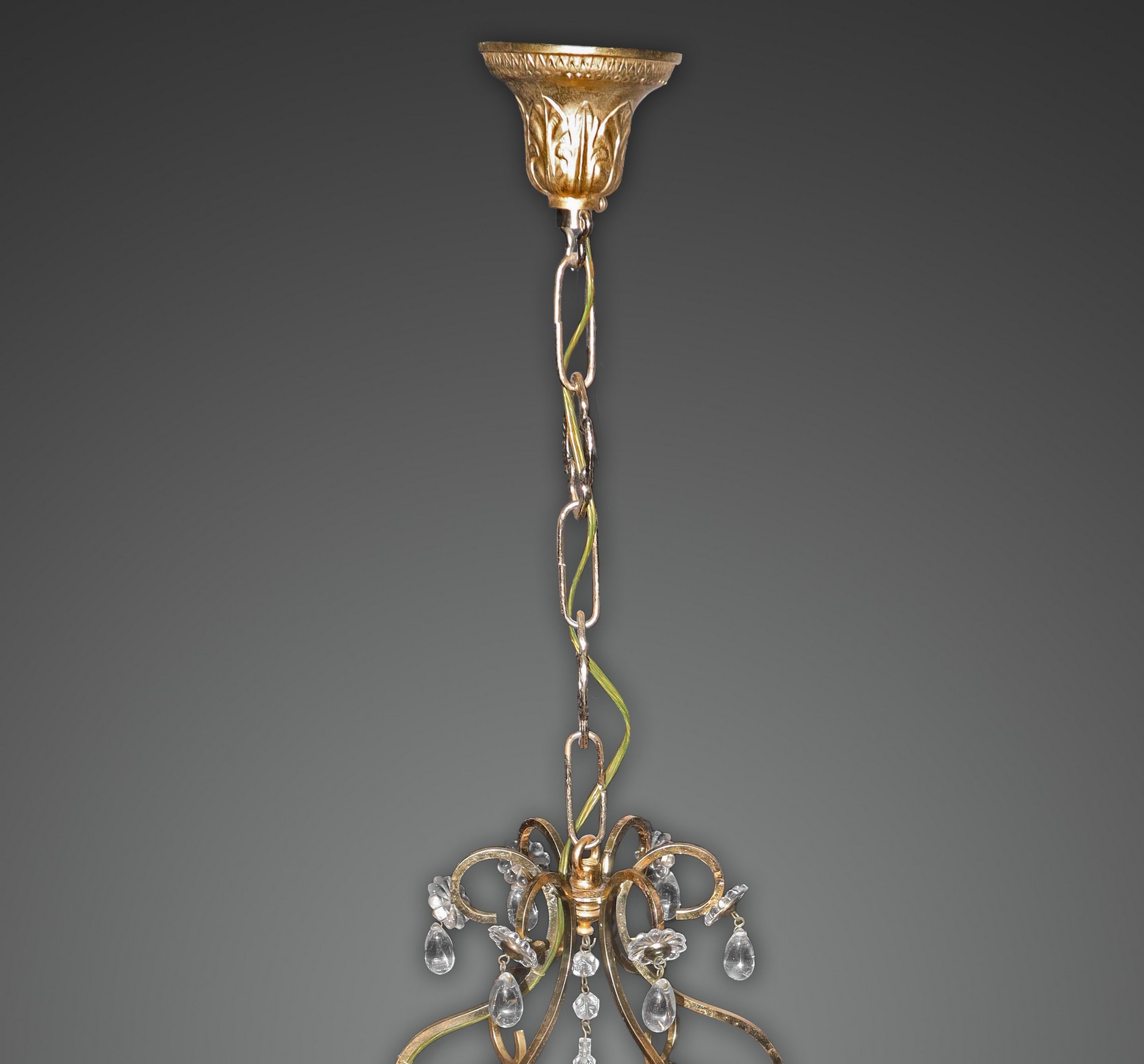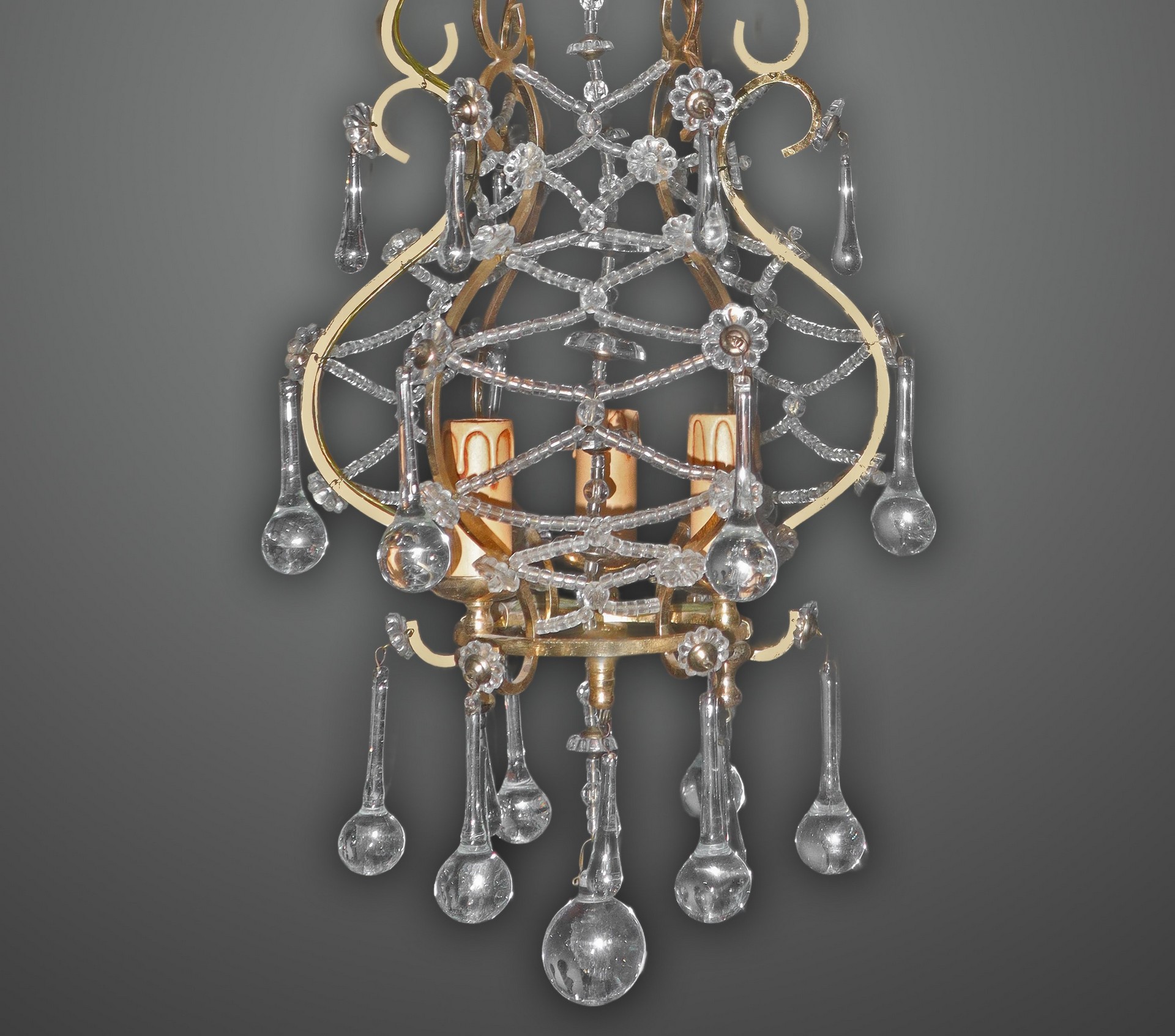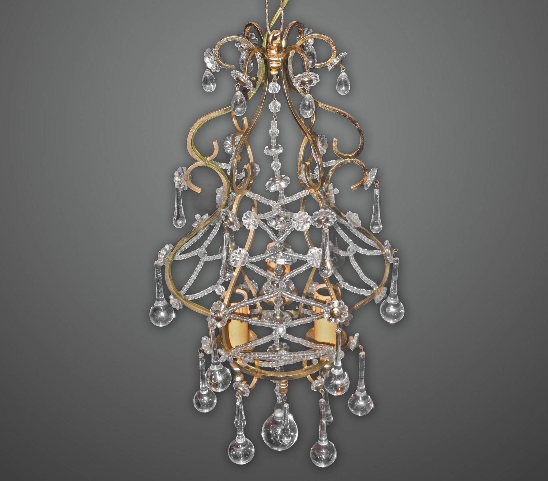 Lampadario a 3 luci in metallo dorato con gocce in vetro di Murano
