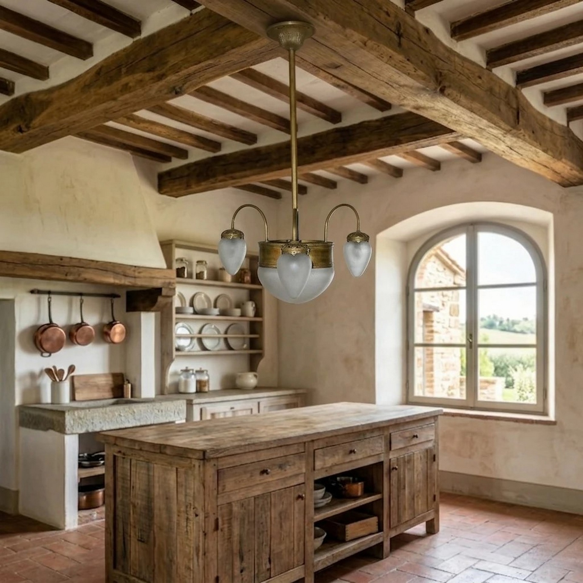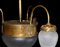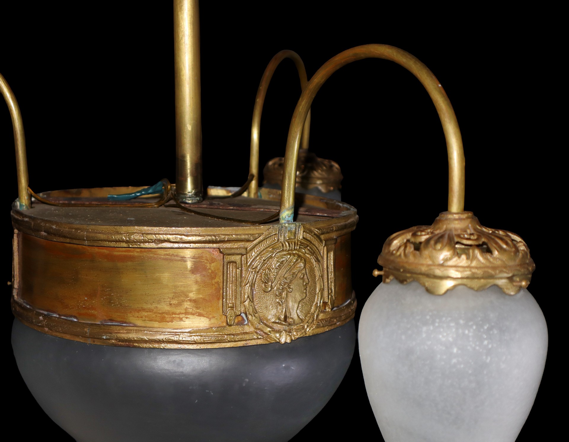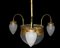 Lampadario Liberty, luce centrale più 3 laterali in vetro a pigna, early 20° secolo Struttura in ottone dorato