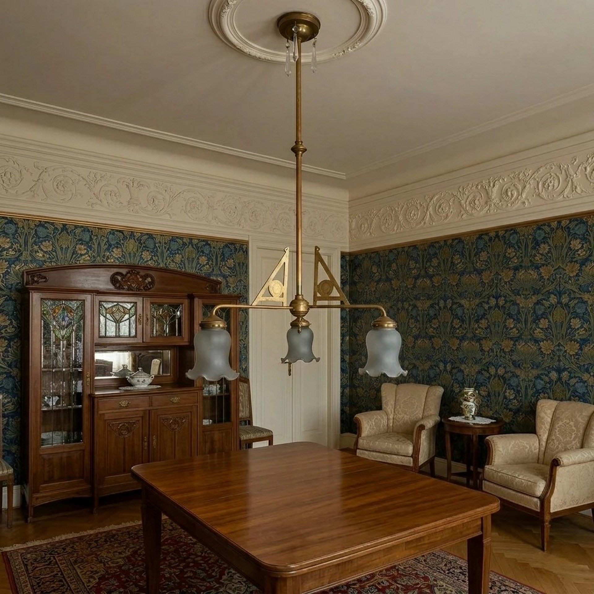 Lampadario 12 Decò a tre luci con vetri in opaline bianco a tulipano, Early 20° secolo