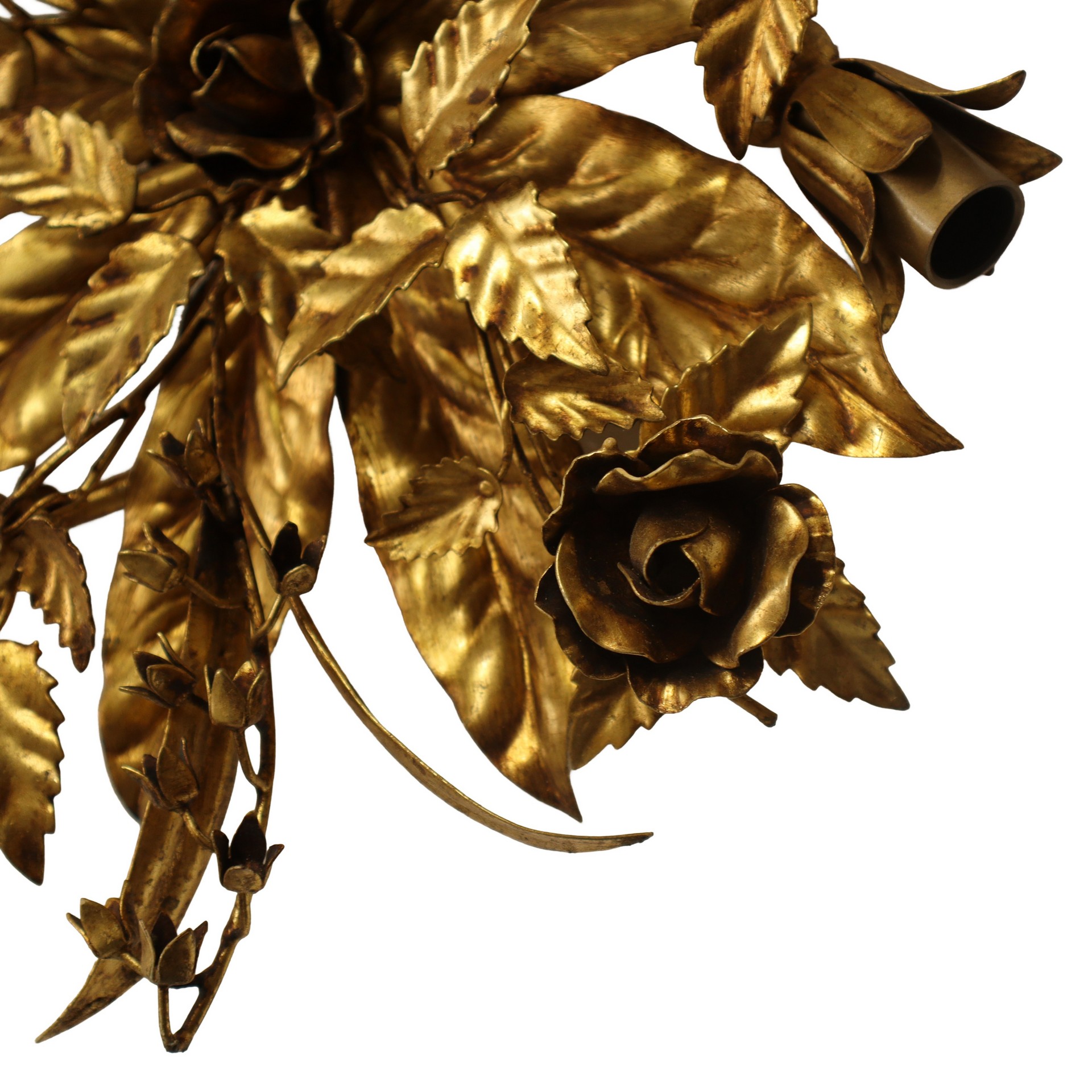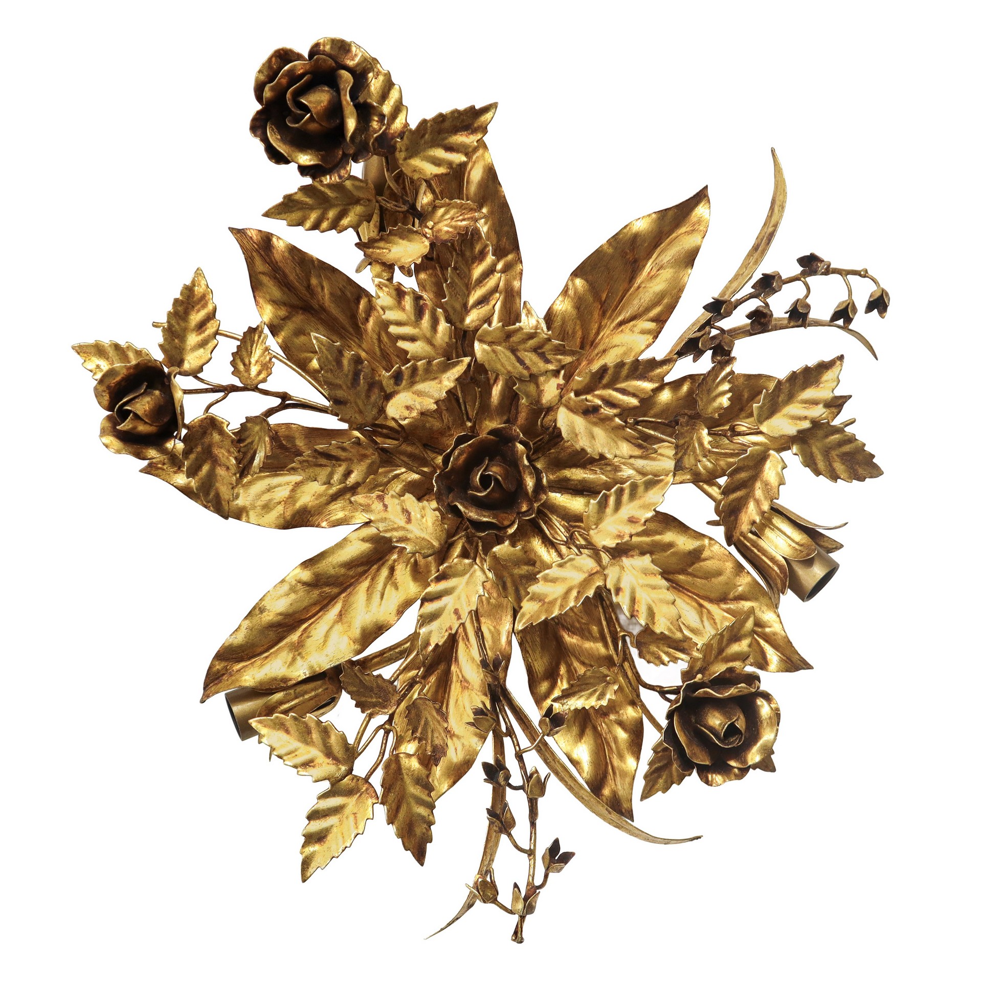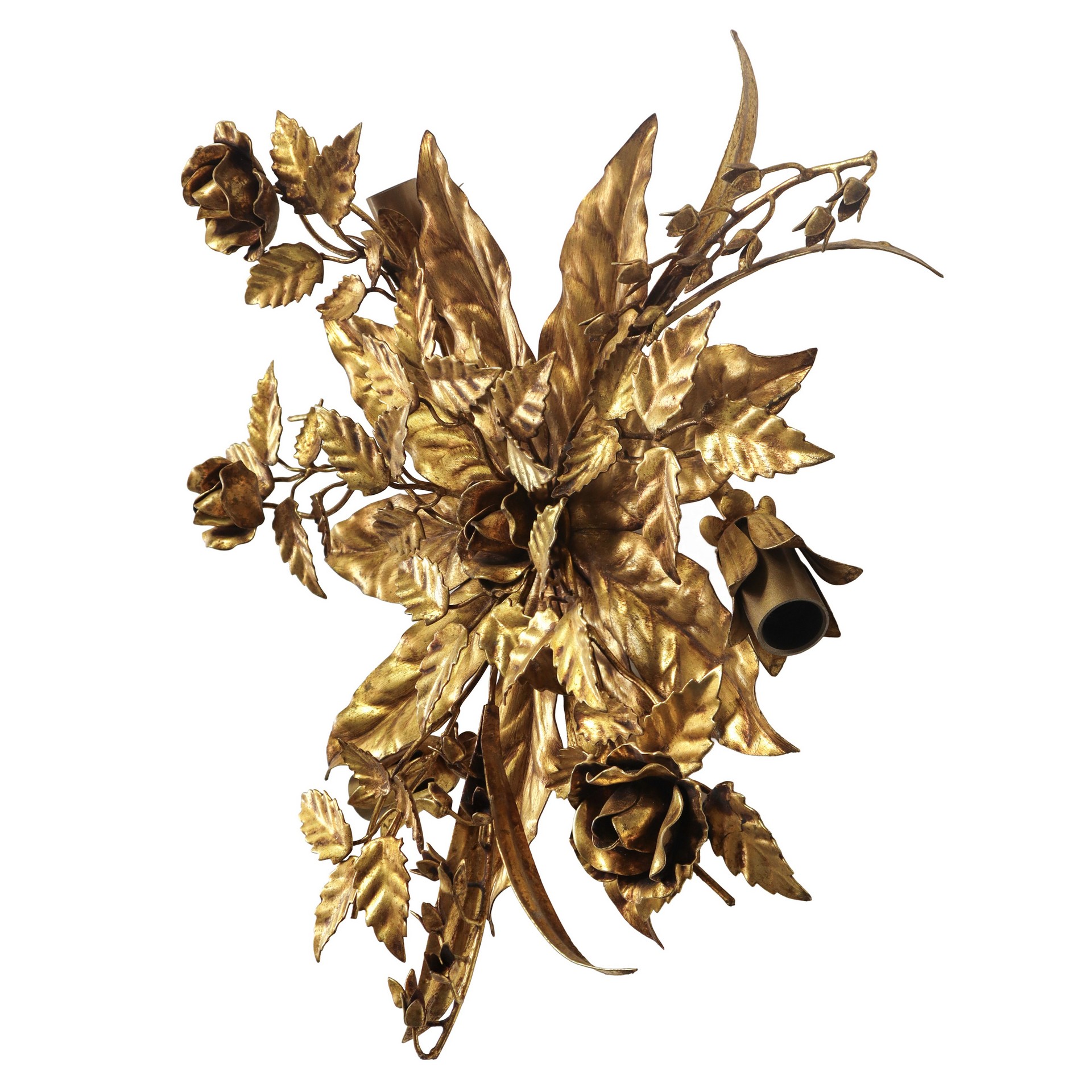 Plafone da tetto o da parete a 3 luci in metallo dorato sbalzato a foglie e fiori h cm 16X45