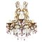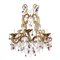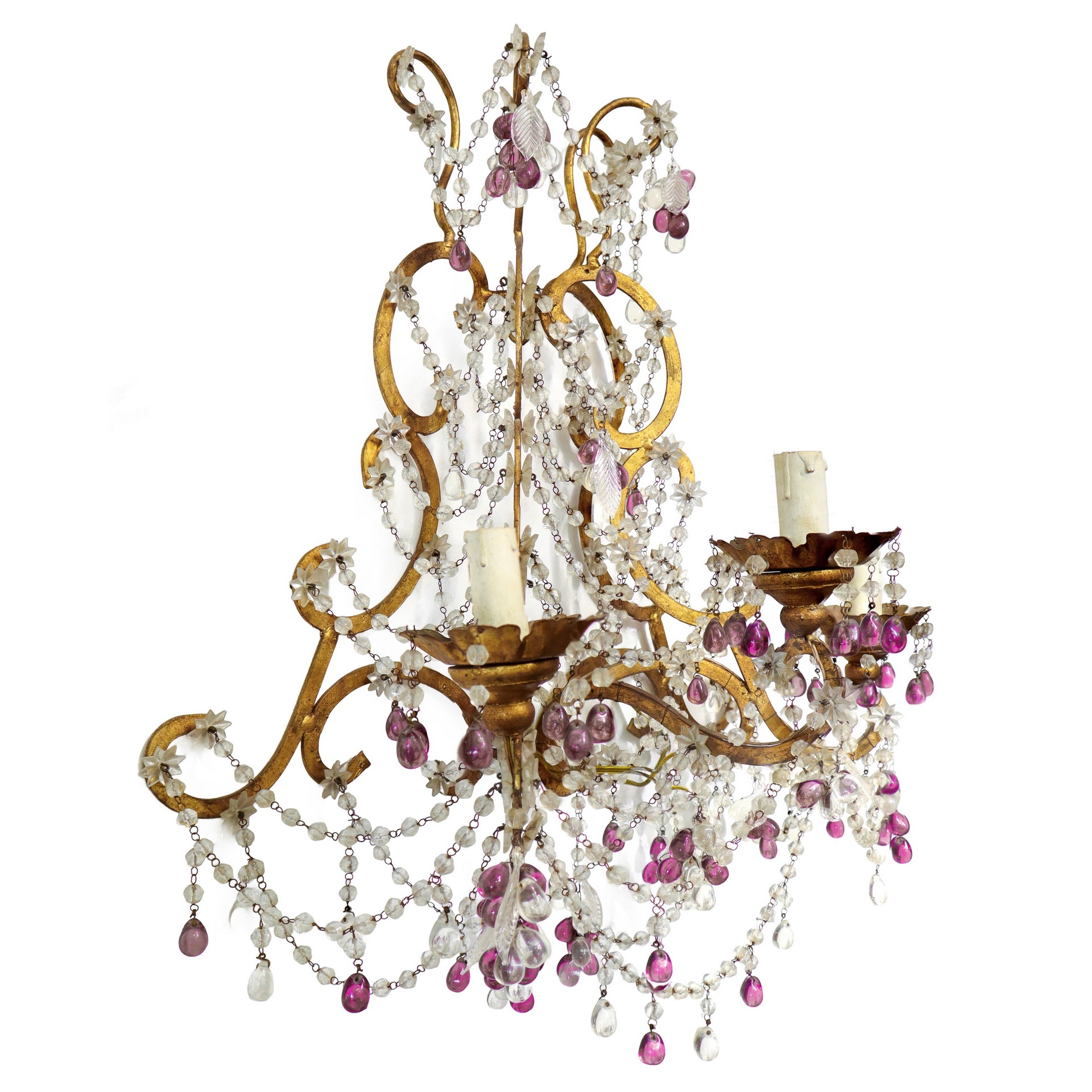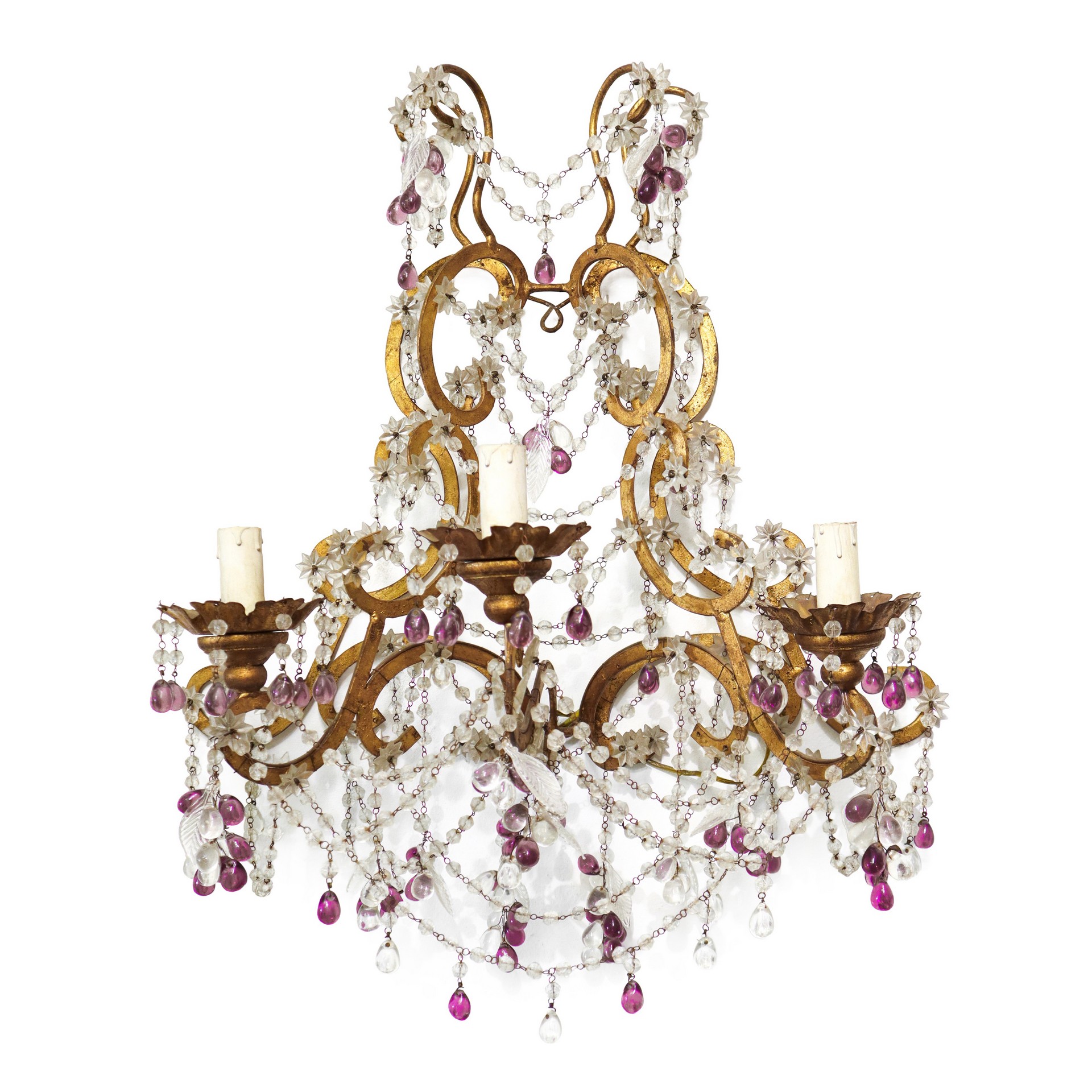 Coppia di appliques in metallo dorato con brindoli in vetro a sfere e fiori bianchi e ametista a tre luci