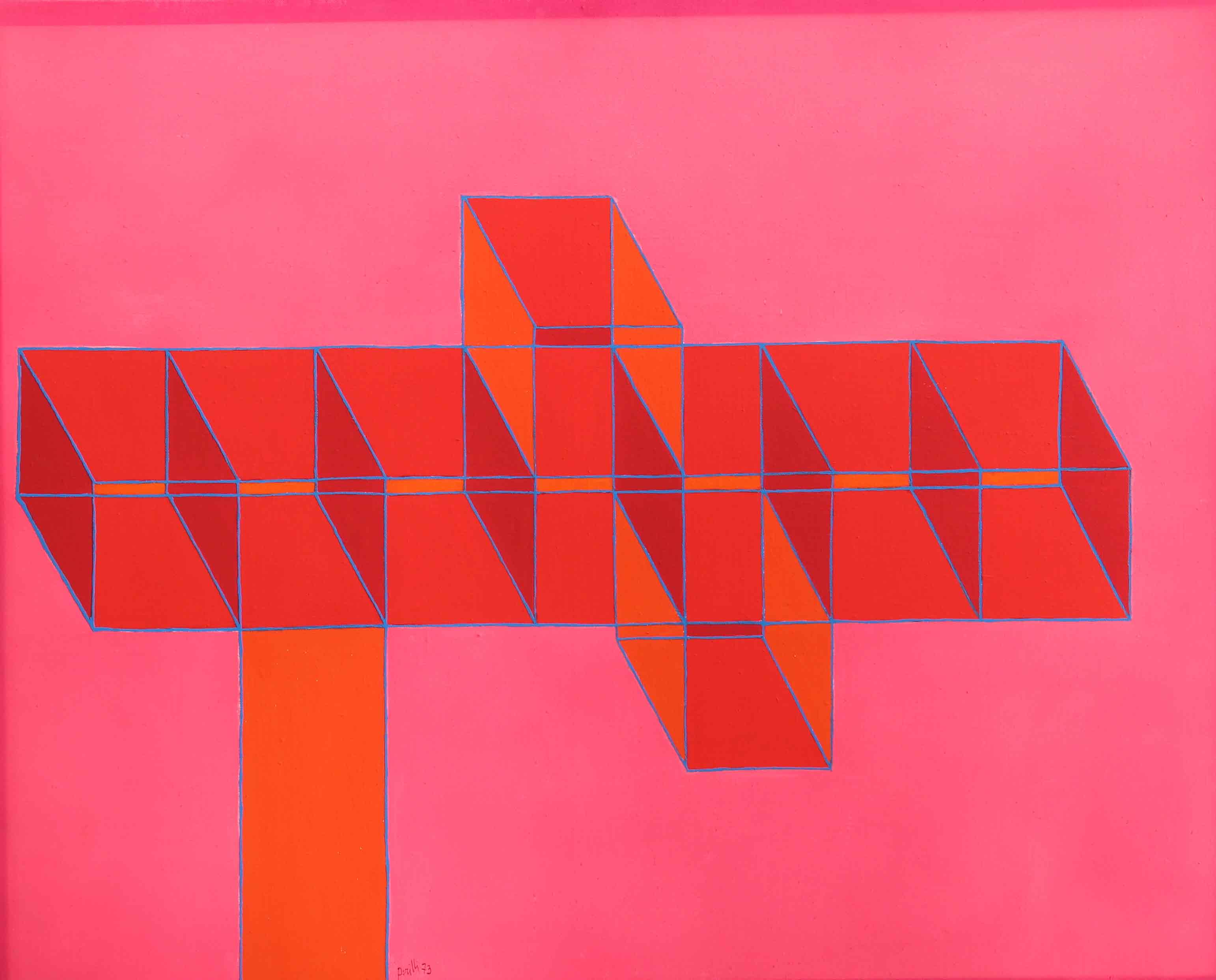 PERILLI ACHILLE La profezia modulare 1973 tecnica mista su tela cm. 81 X 100 Firma, data 'Perilli, 73' (in basso a sinistra) Firma, data, titolo, misure 'Achille Perilli, 1973, La profezia modulare, 81x100'; etichetta della galleria Malborough, Roma; etichetta della galleria Cesarea, Genova (al retro) Provenienza della Galleria d'Arte Rotta Farinelli, Genova