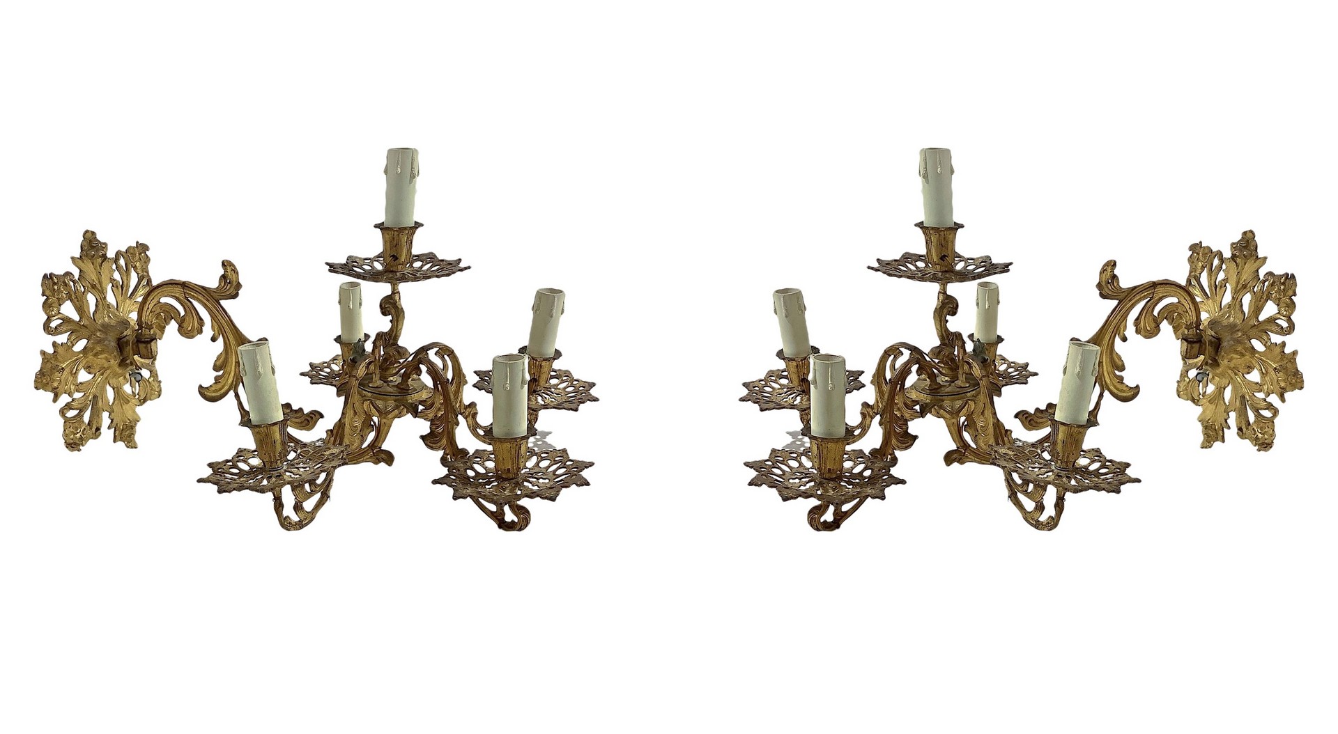 Coppia di applique a cinque luci in bronzo dorato, 19° secolo