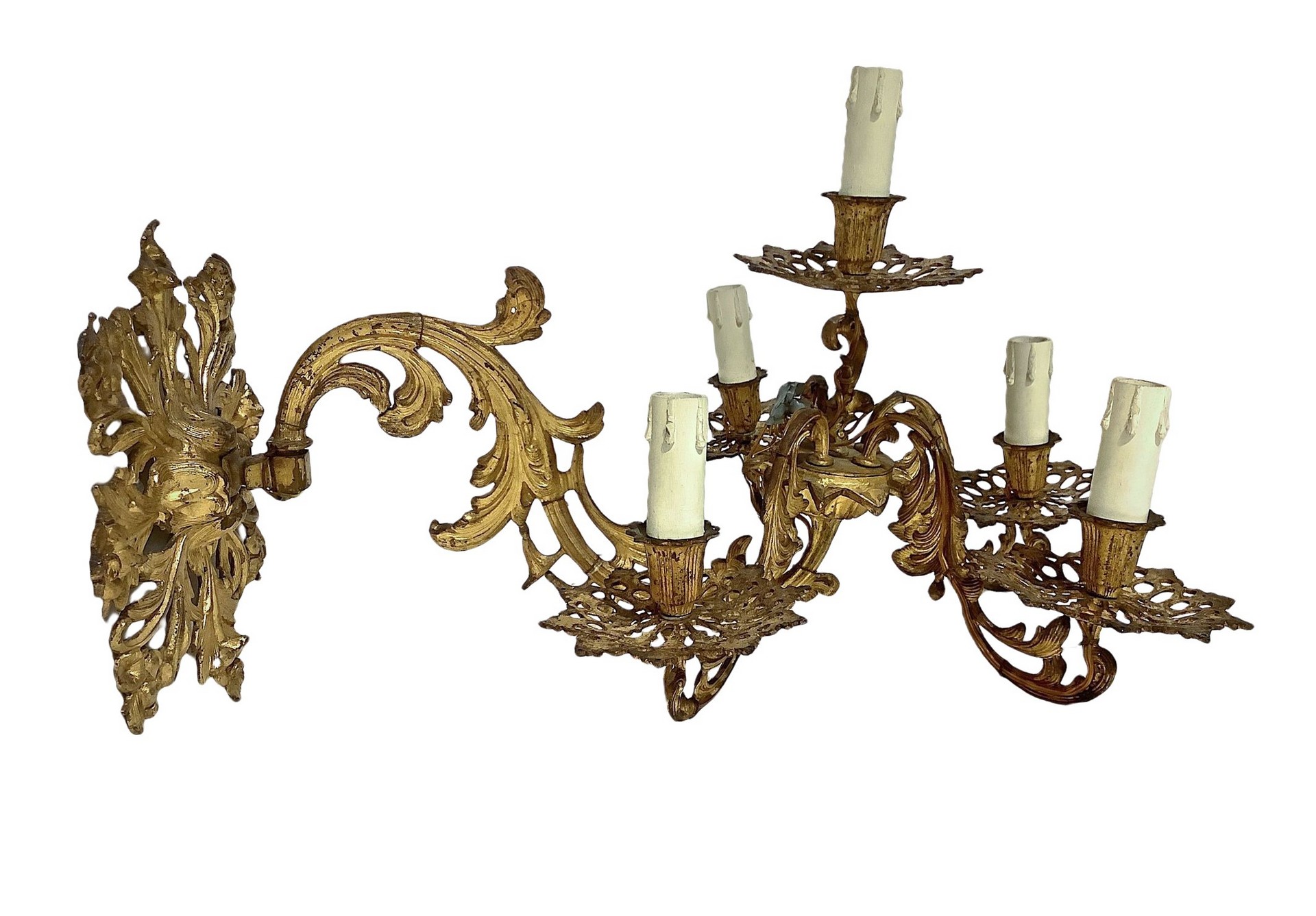 Coppia di applique a cinque luci in bronzo dorato, 19° secolo h 30 cm, l 50 cm