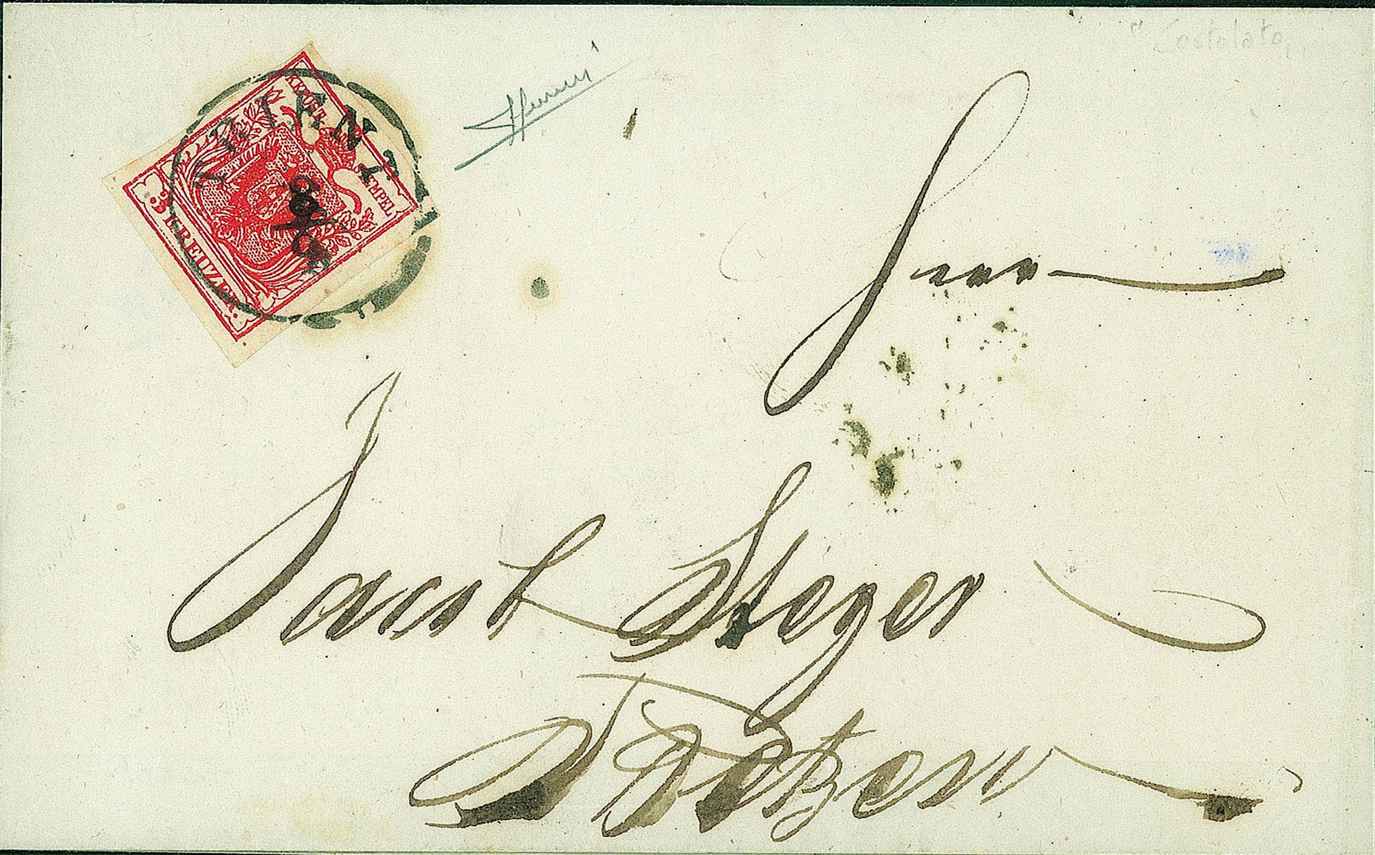 Antichi Stati Italiani - Lombardo Veneto - Territori italiani d'Austria - 3 kreuzer (3a - carta a coste verticali)Lettera da Trento a Bolzano del 8.9.51 - Sorani (1.100+)