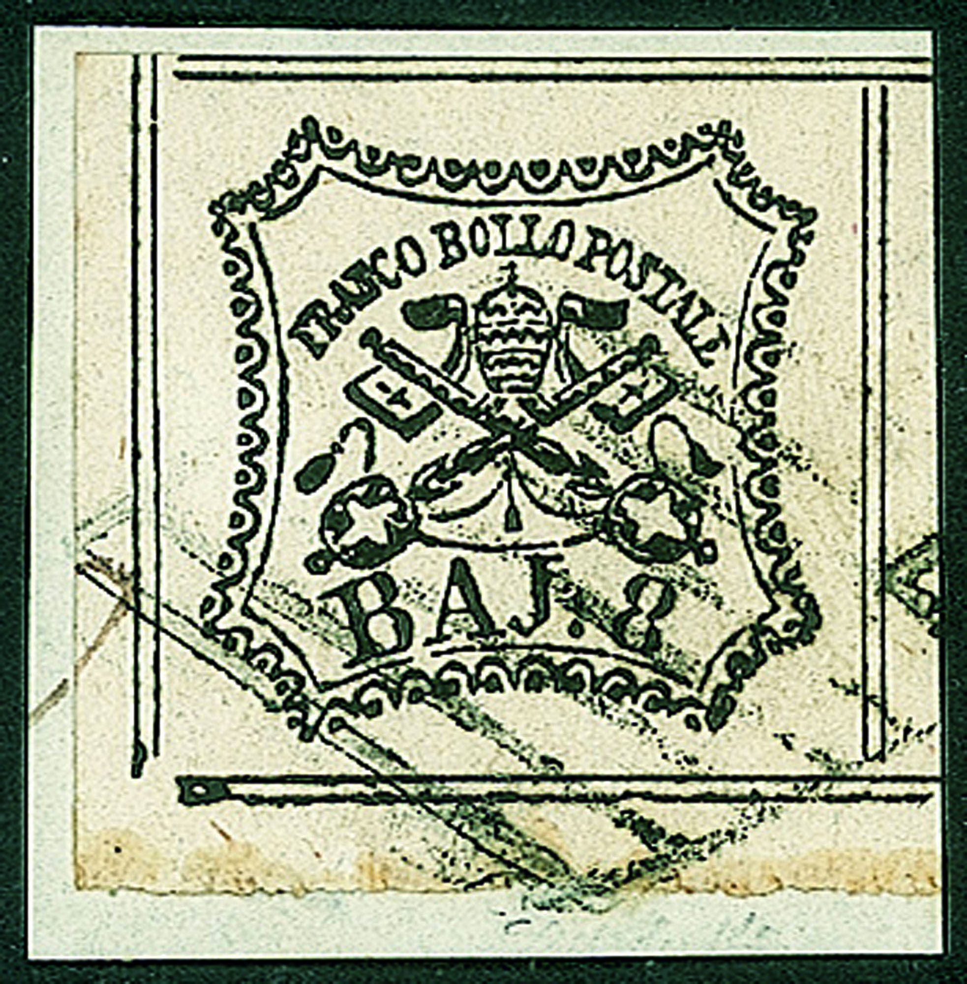 Antichi Stati Italiani - Stato pontificio - 1852 - 8 baj bianco (9)Angolo di foglio con otto filetti usato su frammento - cert. Bolaffi