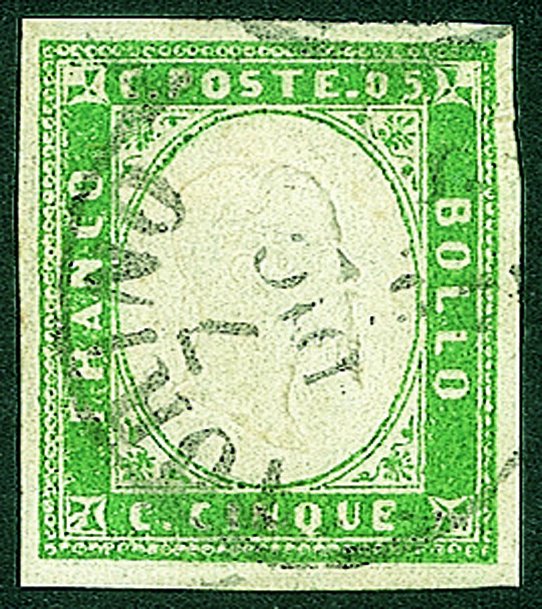 Antichi Stati Italiani - Sardegna - 1855 - 5 cent (13c - verde pisello)Usato a Torino - Diena + Oliva + cert. AG (4.000)