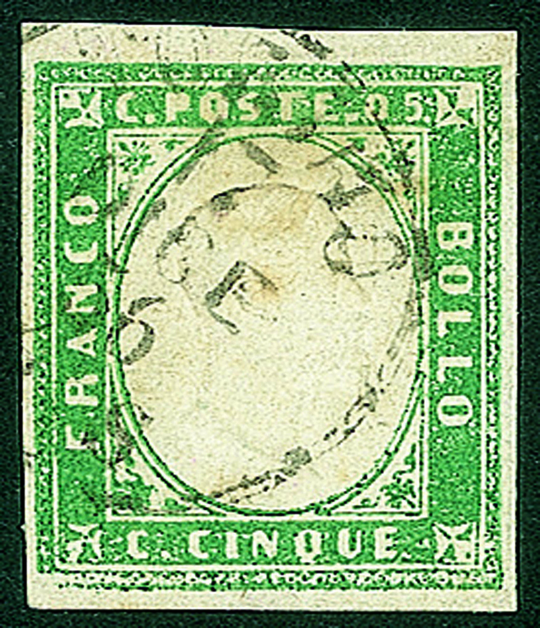 Antichi Stati Italiani - Sardegna - 1855 - 5 cent (13d - verde smeraldo)Usato - Diena (800)