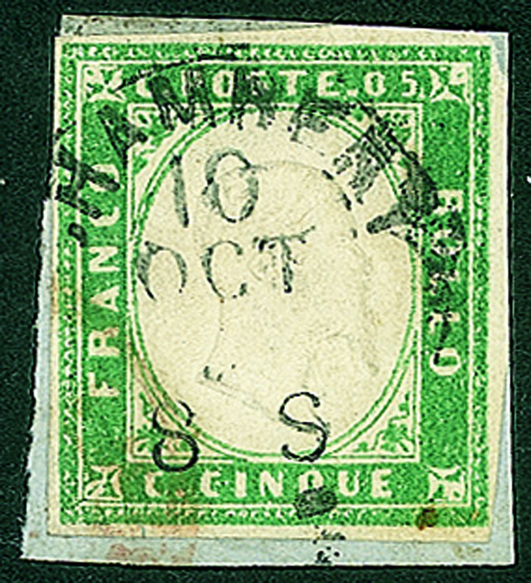 Antichi Stati Italiani - Sardegna - 1855 - 5 cent (13d - verde smeraldo)Usato a Chambery su frammento - cert. AG (950)