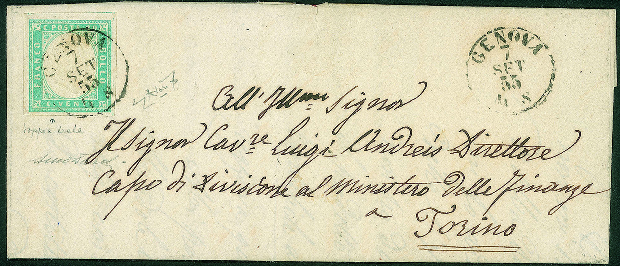Antichi Stati Italiani - Sardegna - Fresca letterina completa di testo interno affrancata con 20 cent cobalto chiaro (15a)Con ampi margini da Genova a Torino del 7.9.55 - raro e pregiato uso nel mese di settembre del 1855 - insieme molto bello e di ottima qualità - cert. Avanzo