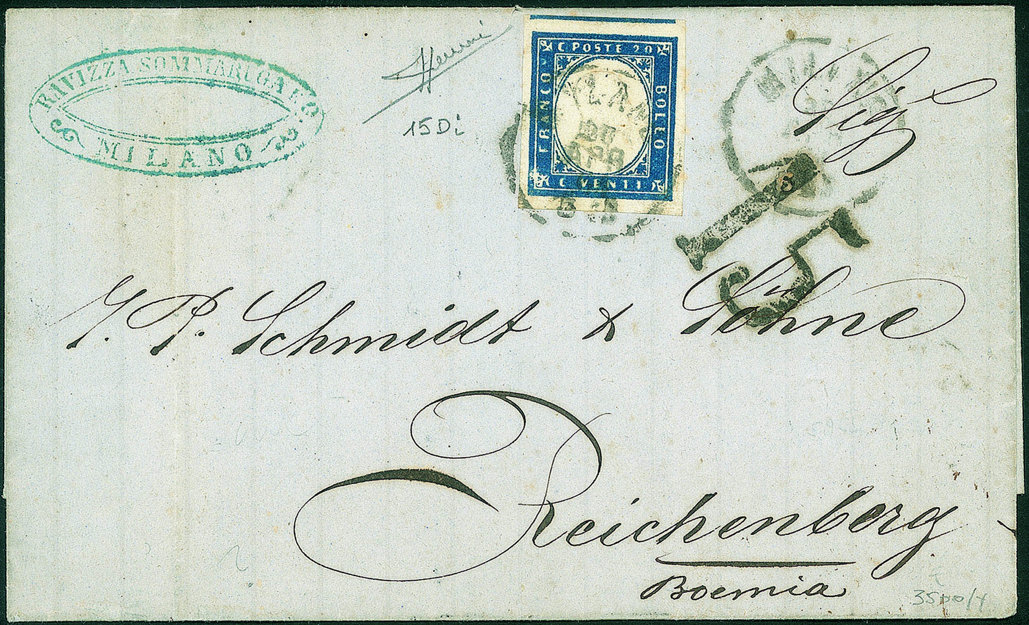 Antichi Stati Italiani - Sardegna - Lettera affrancata con 20 cent cobalto oltremare scuro (15Di)Da Milano per Reichenberg (Boemia) del 20. apr. 1861 - tassata - cert. Sorani
