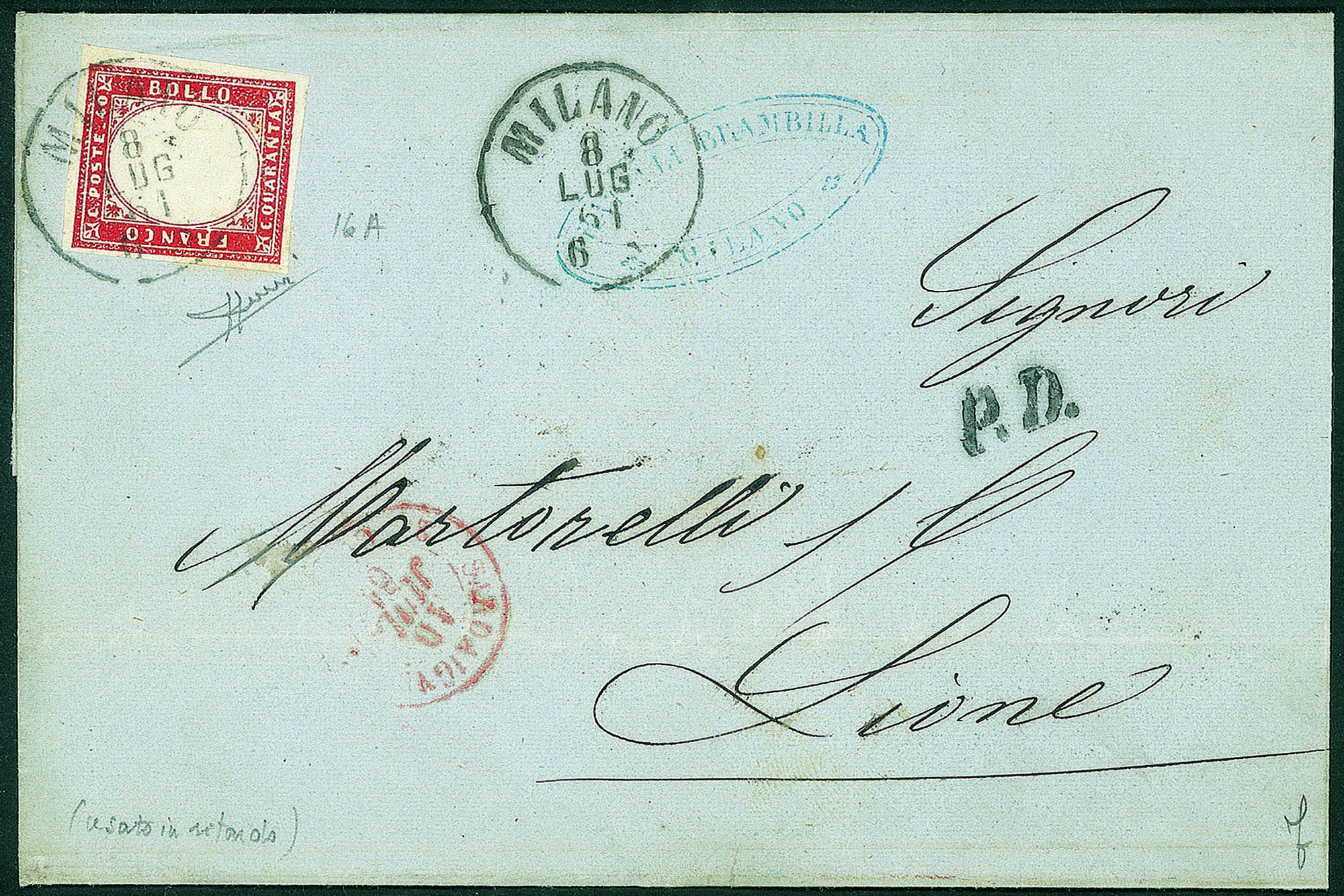 Antichi Stati Italiani - Sardegna - Fresco 40 cent rosso scarlatto (16A)Su lettera da Milano a Lione del 8.7.61 - uso tardivo - Sorani