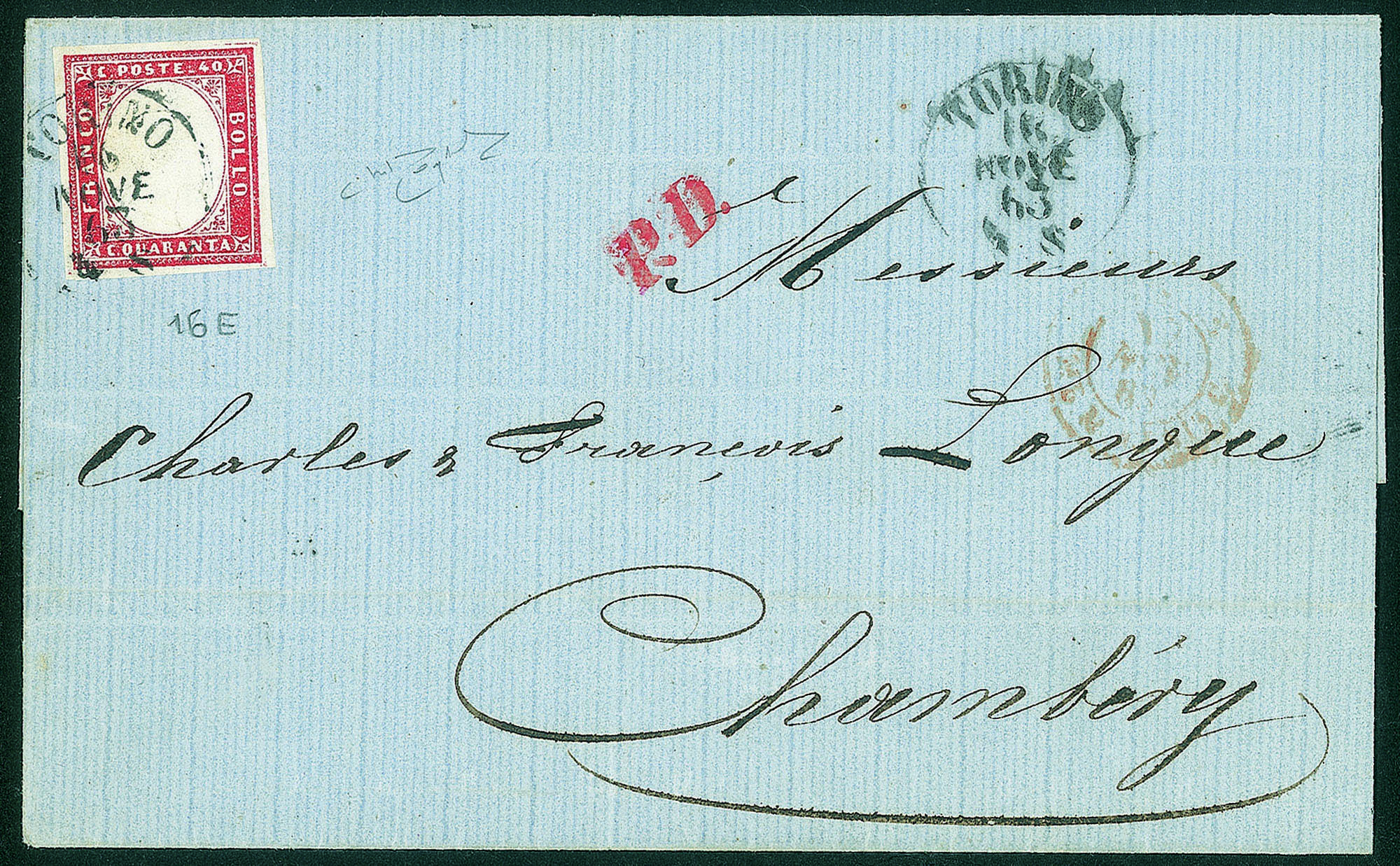 Antichi Stati Italiani - Sardegna - 40 cent rosa carminio (16E)Su lettera da Torino a Chambery del 16.11.63 - Raybaudi