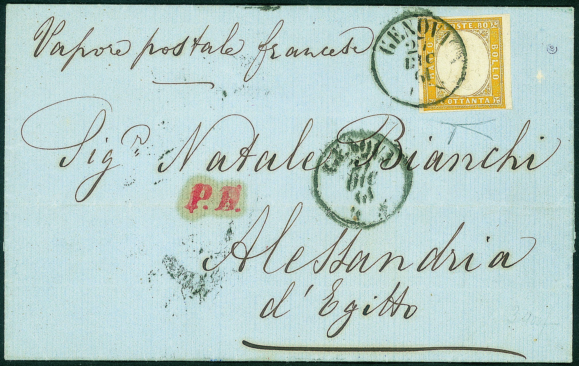 Antichi Stati Italiani - Sardegna - Bell'esemplare del 80 cent giallo arancio (17C)Su lettera da Genova a Alessandria d'Egitto del 27.12.61 - PD (rosso) + Vapore postale francese (manoscritto - molto bella - cert. Bottacchi