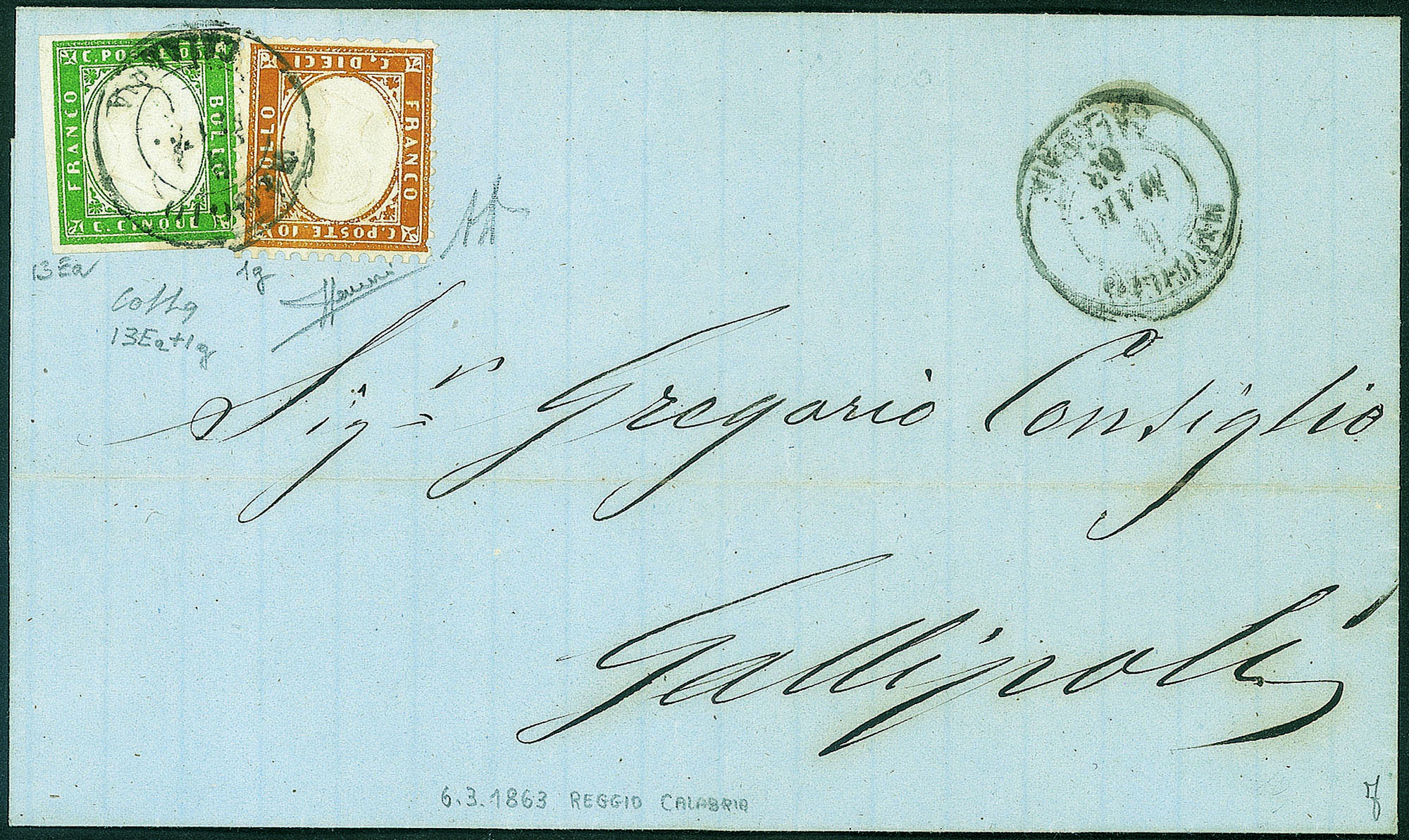 Regno - Vittorio Emanuele II - Mista Sardegna/Regno - 5 cent verde (13Ea)+ 10 cent bistro arancio (1g) su lettera da Reggio Calabria a Gallipoli del 6.3.63 - A. Diena + Colla + cert. Sorani