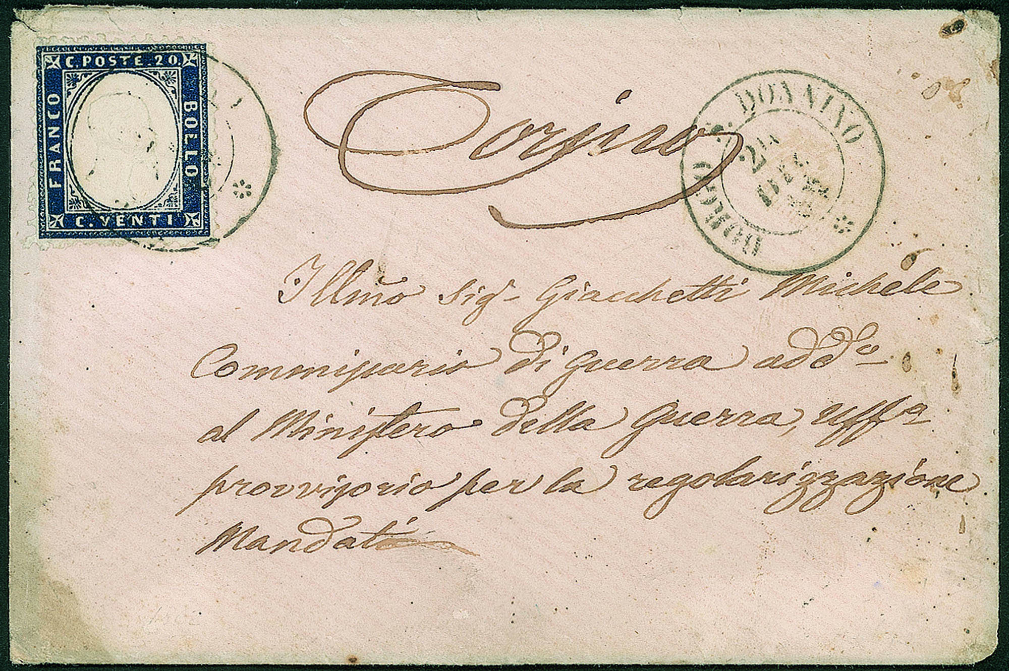 Regno - Vittorio Emanuele II - Bustina colorata (rosa) con 20 cent indaco (2)