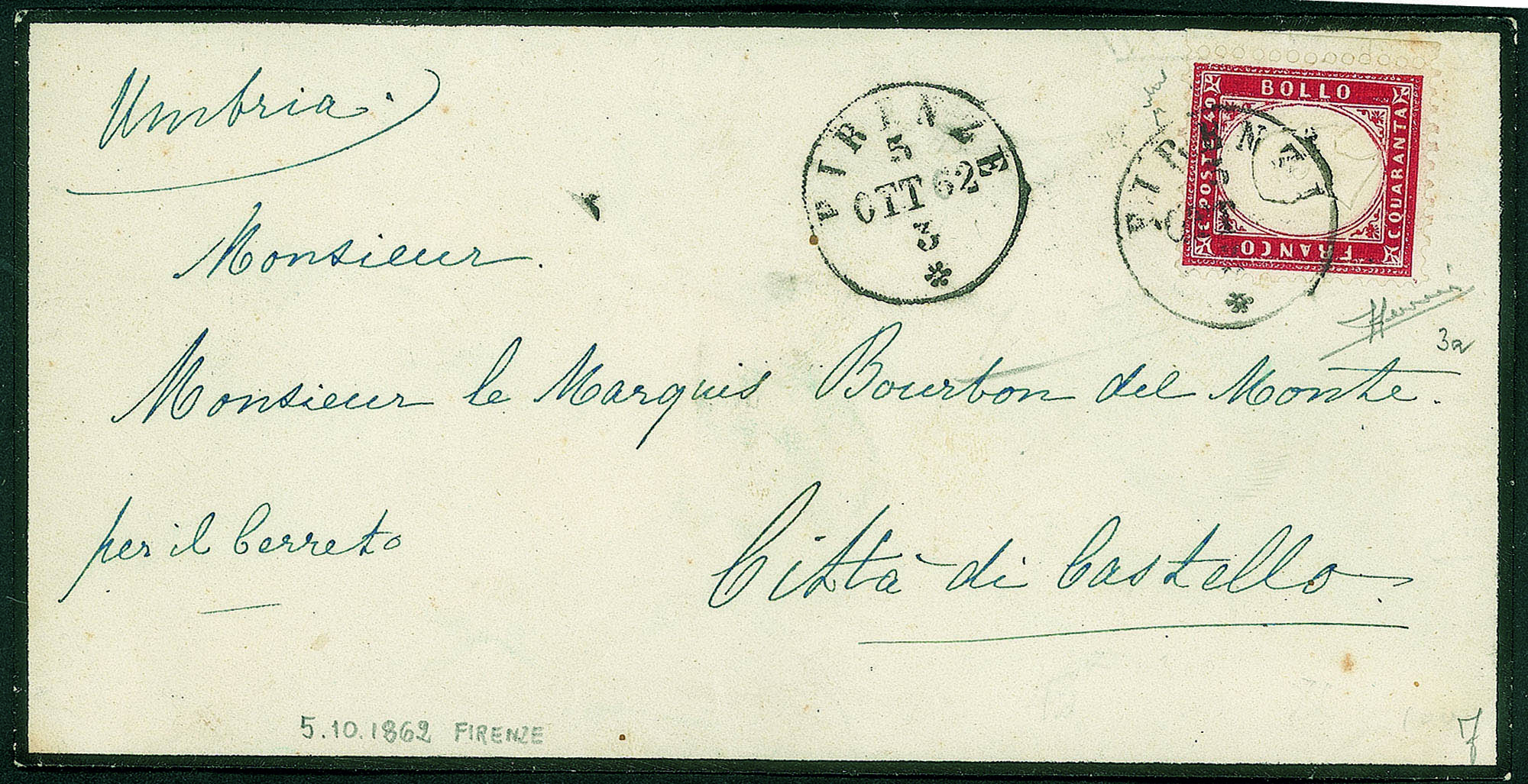 Regno - Vittorio Emanuele II - Bustina affrancata con 40 cent rosso carminio scuro (3a)Da Firenze a Città di Castello del 5.10.62 - Sorani