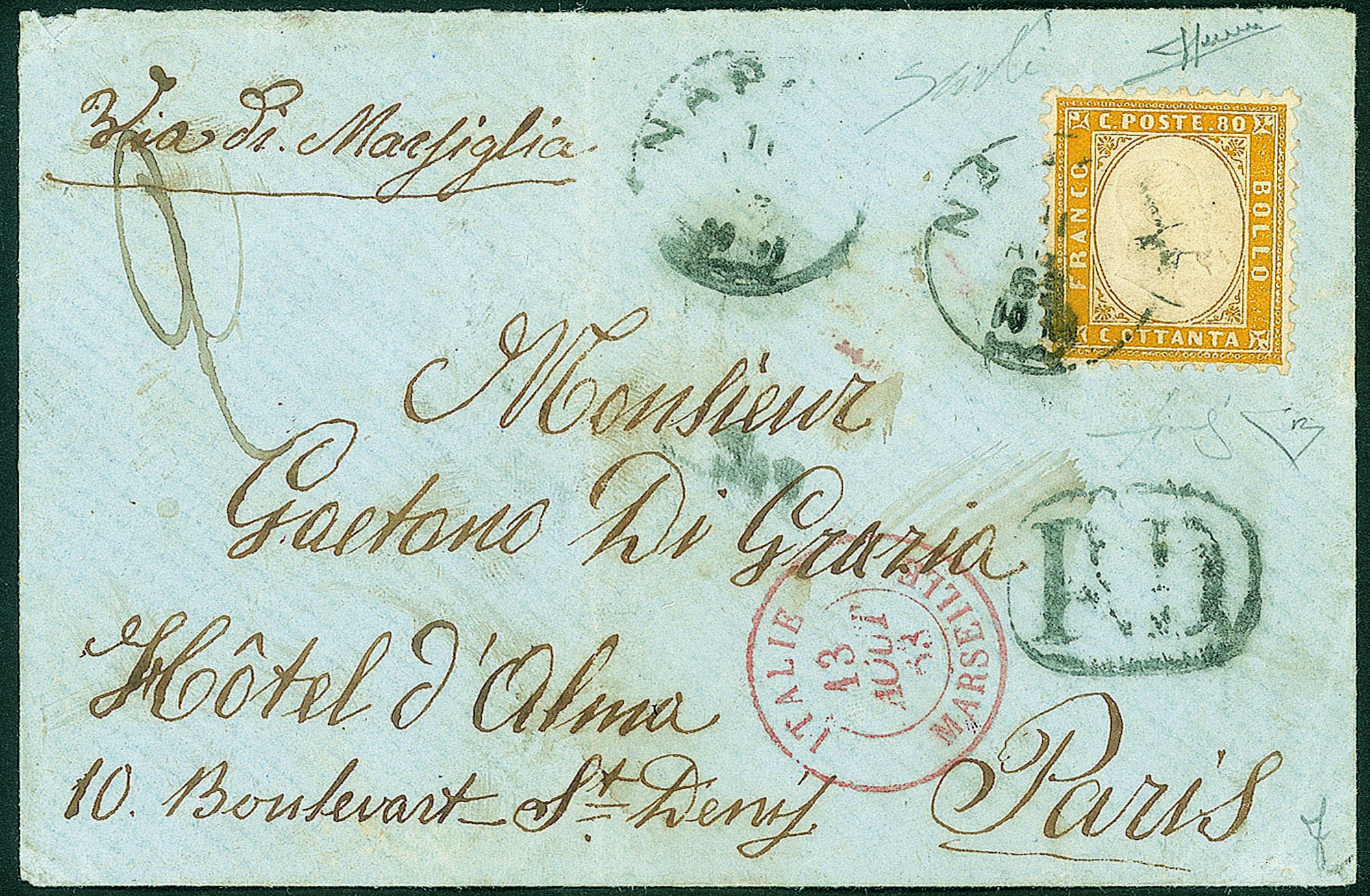 Regno - Vittorio Emanuele II - Esemplare dell' 80 cent giallo arancio (4)Su bustina da Napoli a Parigi del 10.8.63 via di Marsiglia - cert. E. Diena + cert. Sorani